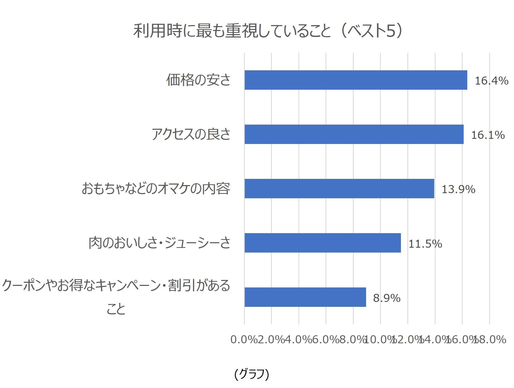 利用の際に最も重視していることは「価格の安さ」が16.4%と最も多く、「アクセスの良さ」「おもちゃなどオマケの内容」と続きました(グラフ)。