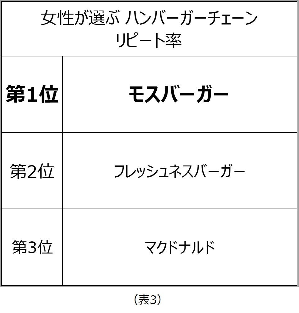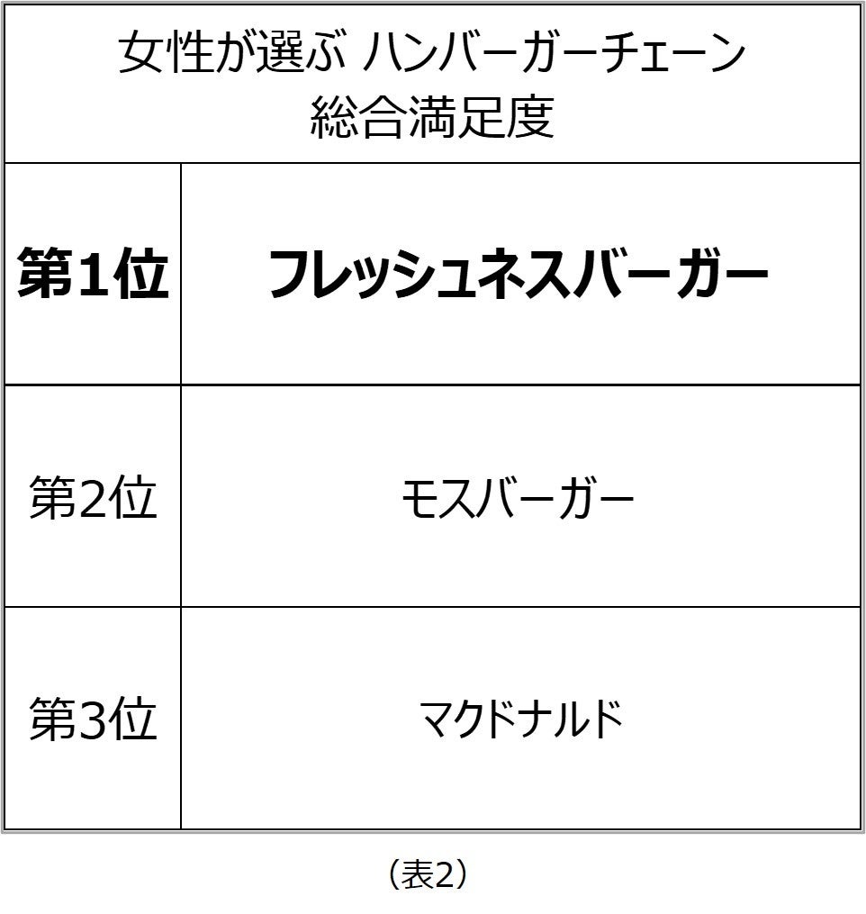 2022年1月に実施した調査において、「マクドナルド」が利用率第1位、「フレッシュネスバーガー」が総合満足度第1位、「モスバーガー」がリピート率第1位となりました(表1~3)。