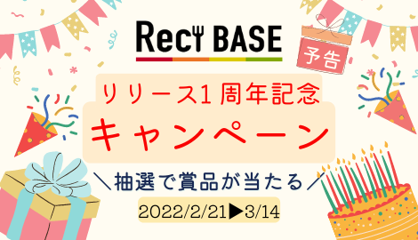 ユーザー様からの多大なご支援をいただき『Reci BASE』は、2月24日で、サービスリリースから1年を迎えます。第一弾のキャンペーンでは、豪華賞品をプレゼントいたします。既存のユーザー様も新規でご登録いただいたユーザー様もキャンペーンに応募いただけますのでぜひお見逃しのないようお願い申し上げます。
