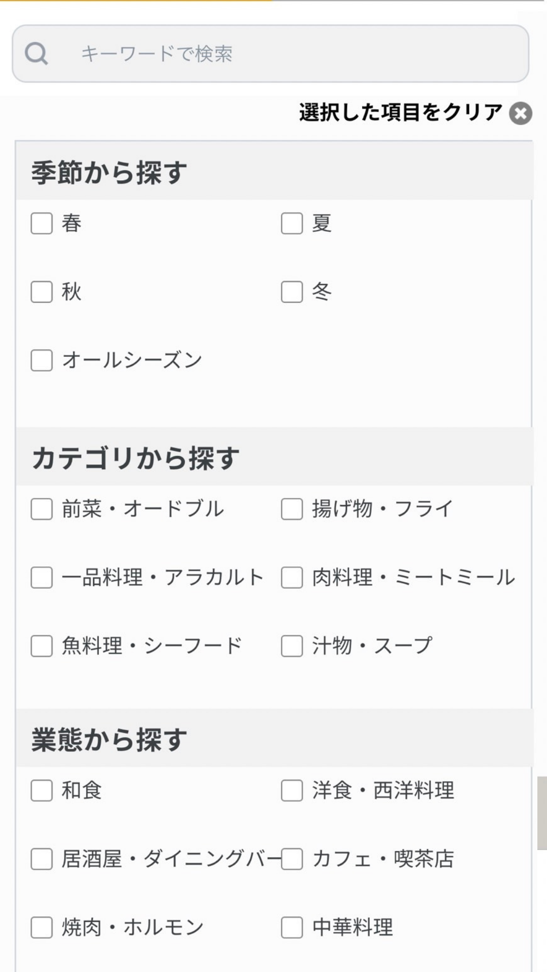 業態、季節、調理時間での、詳細検索ができるようになります。