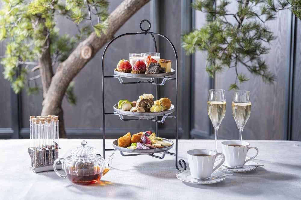 夕刻の時間に楽しむハイティーメニューには、苺と桜をテーマにしたメニューに加え、日本酒との相性が抜群の上質な和牛サーロイン肉寿司と熊本県産馬刺しを胡麻油の風味と有明塩で提供します。シャンパンや日本酒などのフリーフローと、ドバイの7つ星ホテルで提供されているロンネフェルトの紅茶と共にお楽しみください。