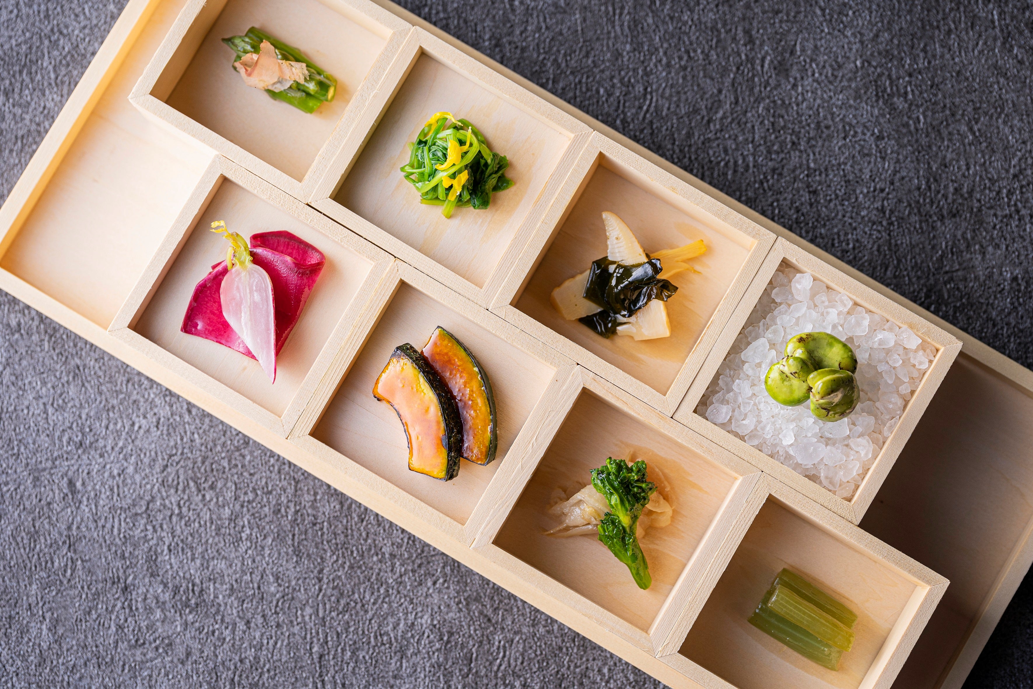 (わさび菜油揚げお浸し/筍若布/スナップエンドウ/ふき煮浸し/塩とまと/焼きそら豆/うるい分担和え/わらび土佐酢和え)