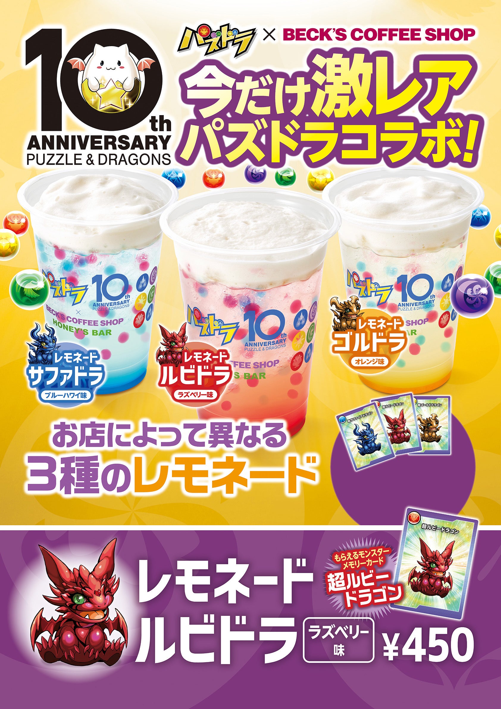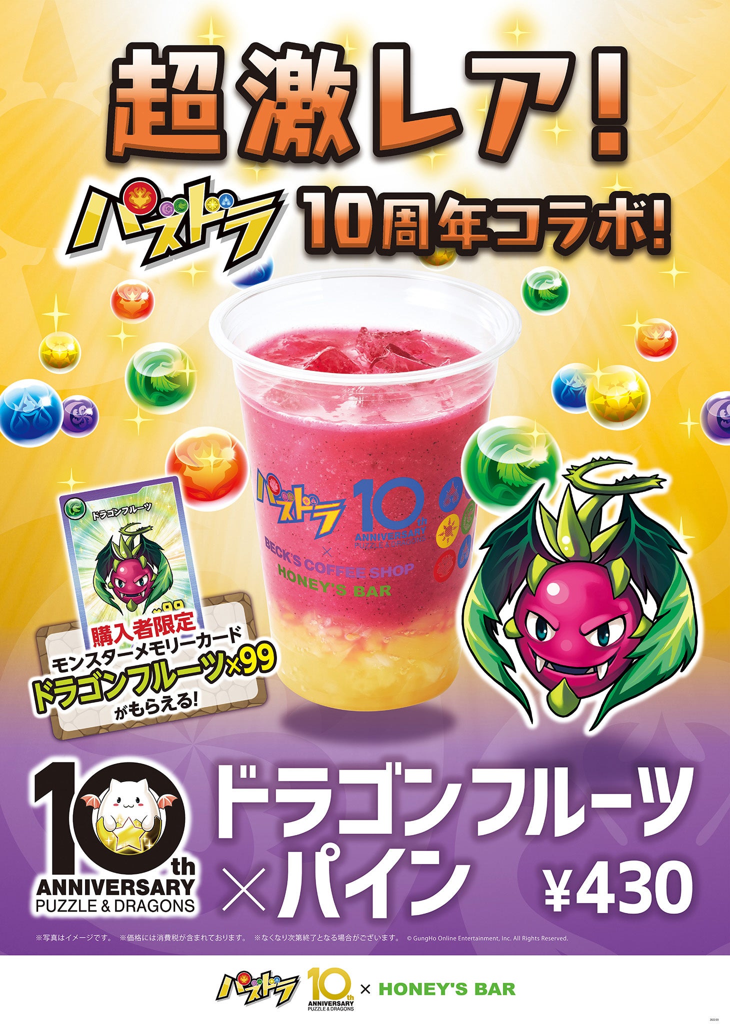 株式会社JR東日本クロスステーション フーズカンパニー(所在地:東京都台東区、カンパニー長:日野正夫)は、首都圏のエキナカを中心に展開している「ベックスコーヒーショップ」「ハニーズバー」において、ガンホー・オンライン・エンターテイメント株式会社(所在地:東京都千代田区、代表取締役社長CEO:森下一喜)が提供するスマートフォン向けパズルRPG「パズル&ドラゴンズ」(通称:パズドラ)との初のコラボレーションタイアップを、2022年3月22日(火)から実施いたします。期間中、対象店舗において、ゲームの世界観やおなじみのモンスターをモチーフにしたコラボドリンクの販売と限定モンスターメモリーカードをプレゼントするほか、パズドラ10周年特設サイトにて割引クーポンを配信いたします。