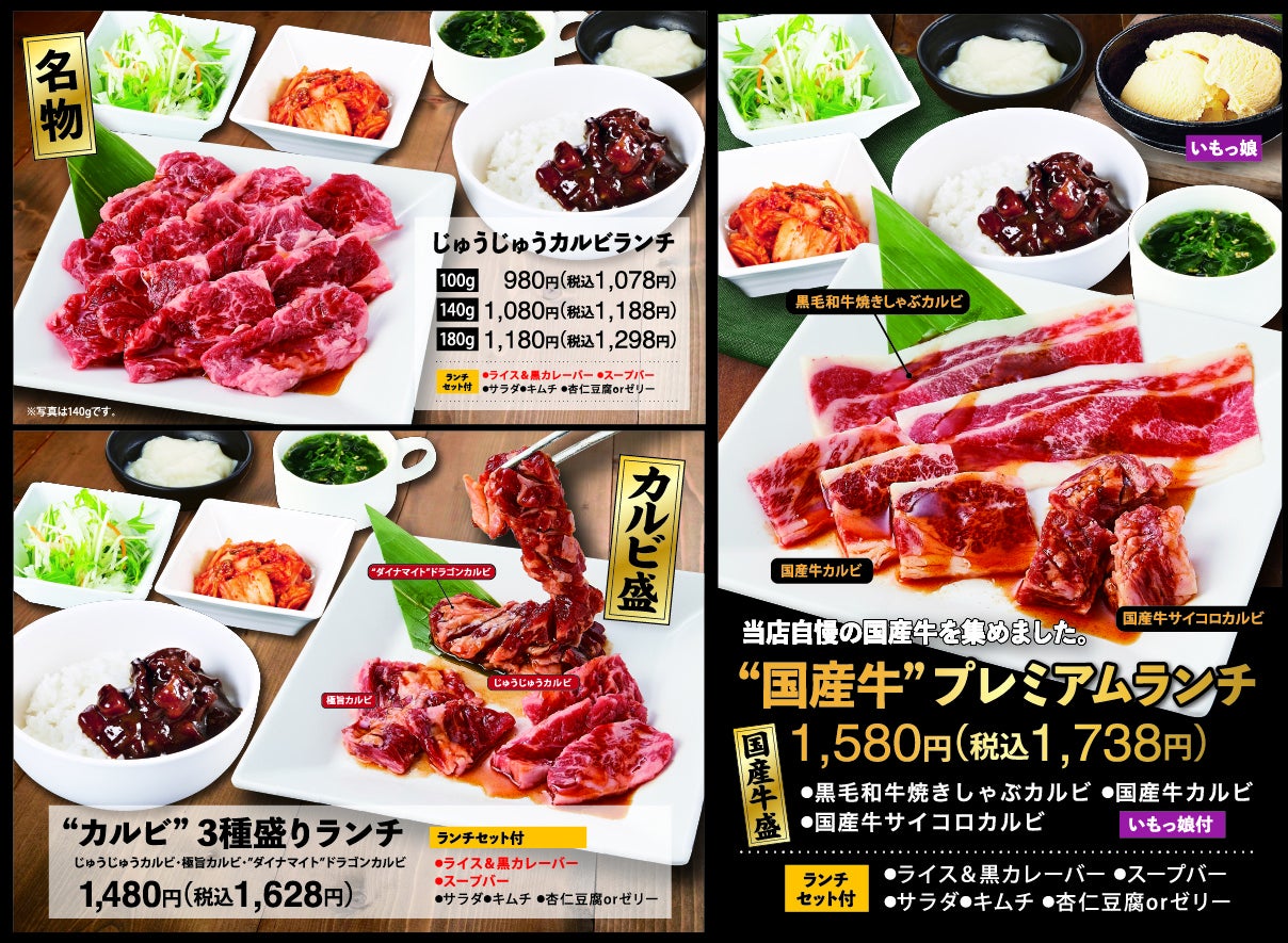 定食ランチは、カルビにさらに磨きがかかった「じゅうじゅうカルビランチ」や3種類のカルビが一度に味わえる「”カルビ”3種盛りランチ」、そして国産牛で贅沢三昧の「”国産牛”プレミアムランチ」など、豊富なメニューを取り揃えております。