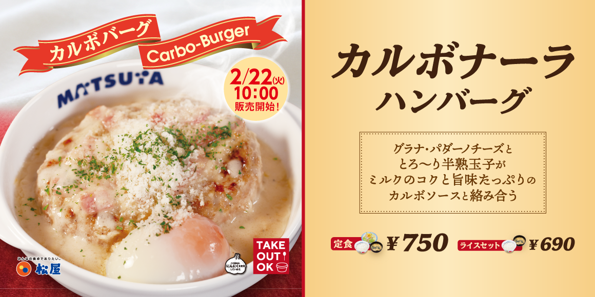 | 商品名 カルボナーラハンバーグ定食(生野菜・ライス・みそ汁付) 750円 カルボナーラハンバーグライスセット(ライス・みそ汁付) 690円 カルボナーラハンバーグ単品 550円 ※お持ち帰りいただけます。お持ち帰りにみそ汁は付きません。 お持ち帰りの場合、みそ汁は別途60円でお求めいただけます。 ※全て税込み価格です。また、店内・お持ち帰りの税込価格は同一です。 発売日 2022年2月22日(火)午前10時~ 対象店舗 一部店舗を除く全国の松屋 |