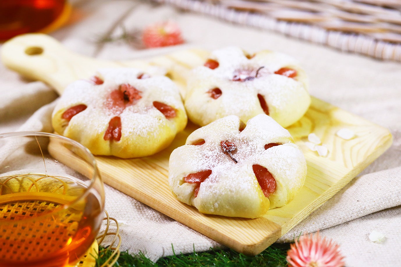 もっちりとした白いパン生地に桜あんとお餅を包んで焼き上げ、仕上げにさくらの花をトッピングした「さくらあんぱん」。口の中で桜の風味豊かな香りが広がり、季節感をお楽しみいただける期間限定商品です。