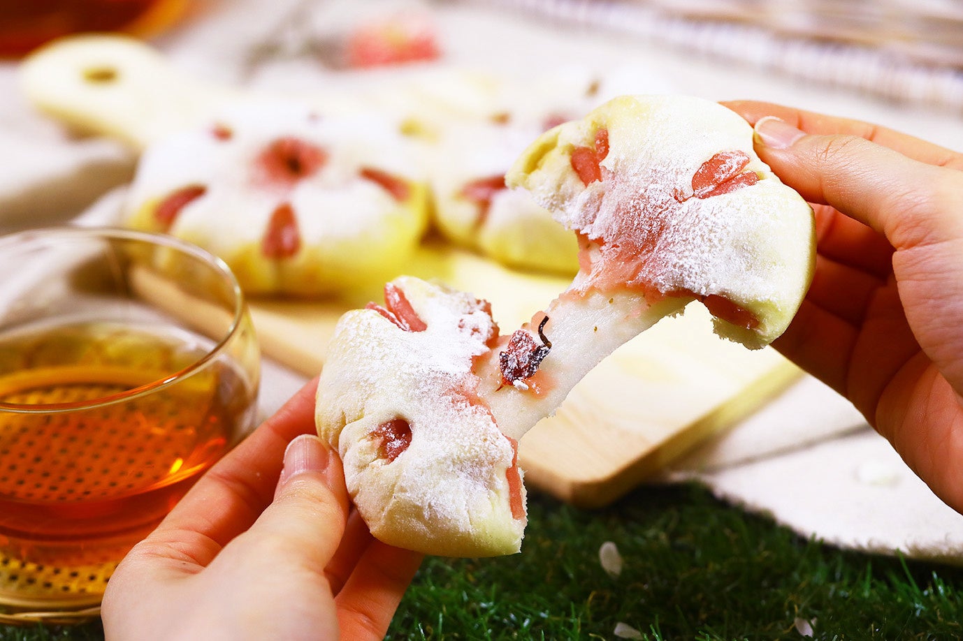 また、中に包んだお餅のもちもち感もお楽しみいただけます。桜あんとお餅の組み合わせがまるで桜餅を食べているかのような味わい。桜あんのほんのりとした甘さの中に、さくらの花の塩気が引き立ちます。ビジュアルや味わいからもひと足お先に春をお楽しみいただけます。