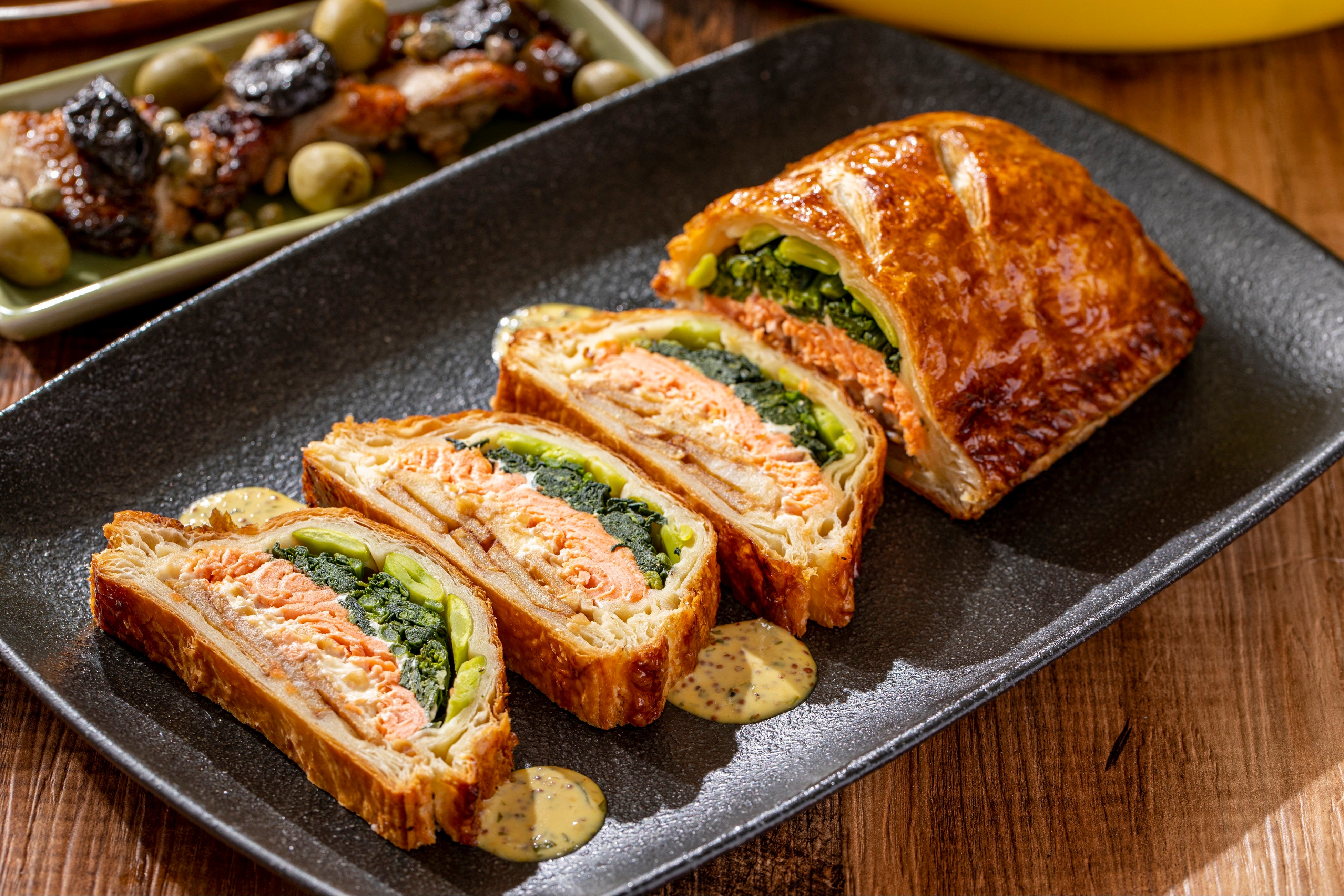 サーモンと春野菜のメープルパイ包み焼き白溜まりと美ノ久粒マスタードのソースオランデーズ