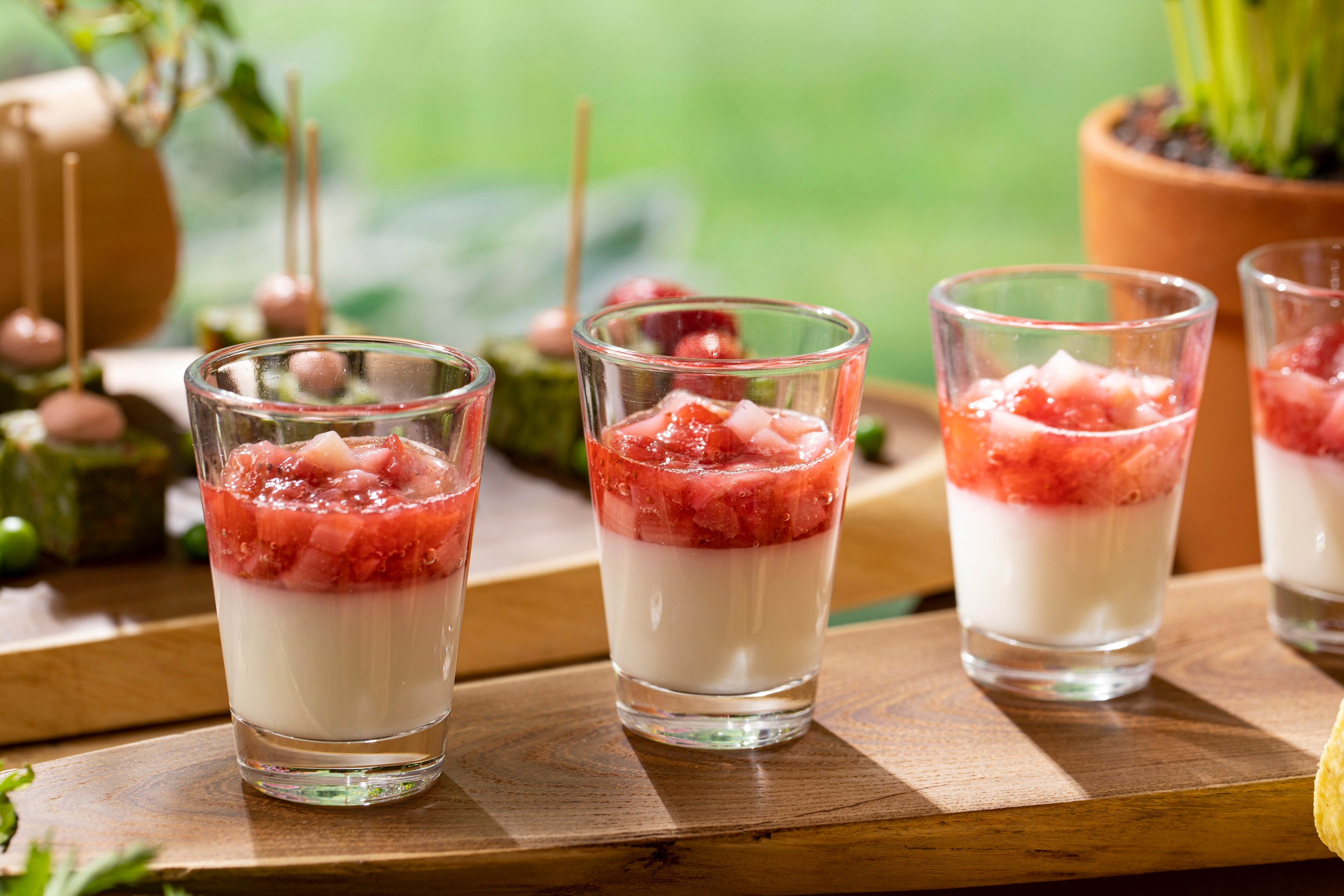 ホワイトアスパラガスの葛餅風ゼリーの上に、ホワイトバルサミコを使いキレよく仕上げた鮮やかな赤のイチゴのチャツネを。