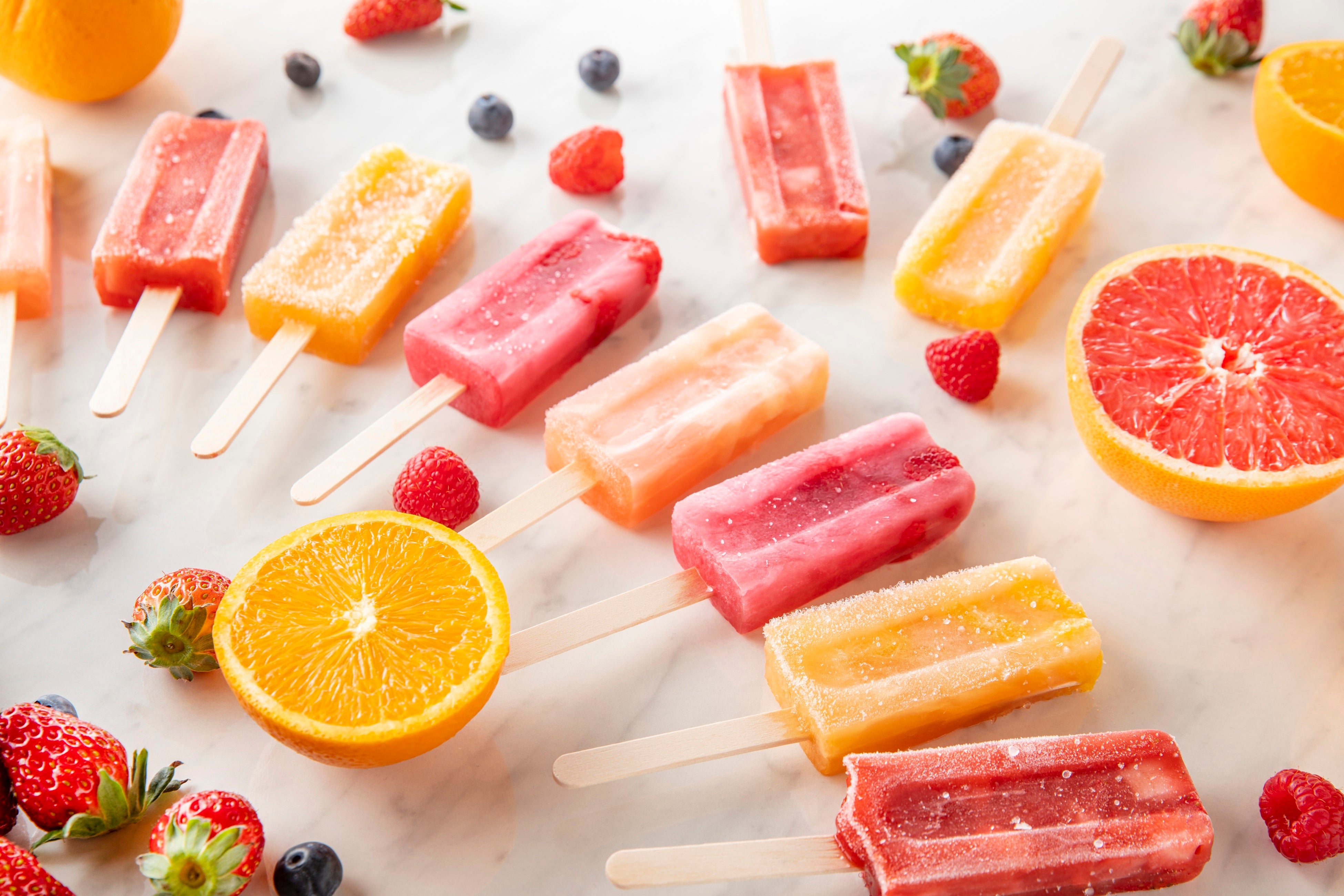 赤とピンクのカラーで見た目もかわいい、ホテルメイドのアイスキャンディー。ストロベリー、ピンクグレープフルーツ、ピーチ、ブルーベリー&カシスの4種をご用意。