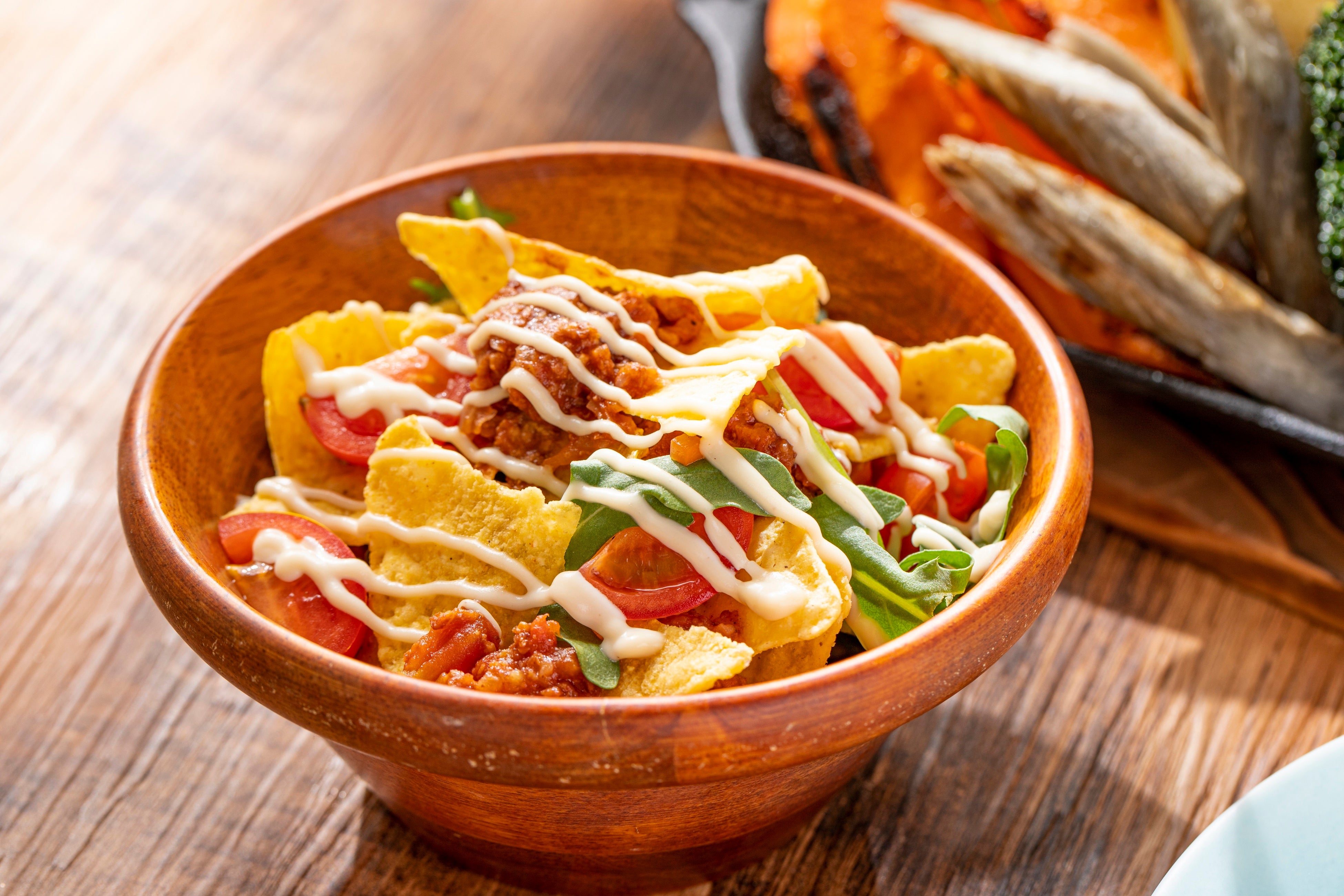 プラントベースミートに、カシューナッツのクリームを合わせた、うま味とコクたっぷりのナチョスサラダ。