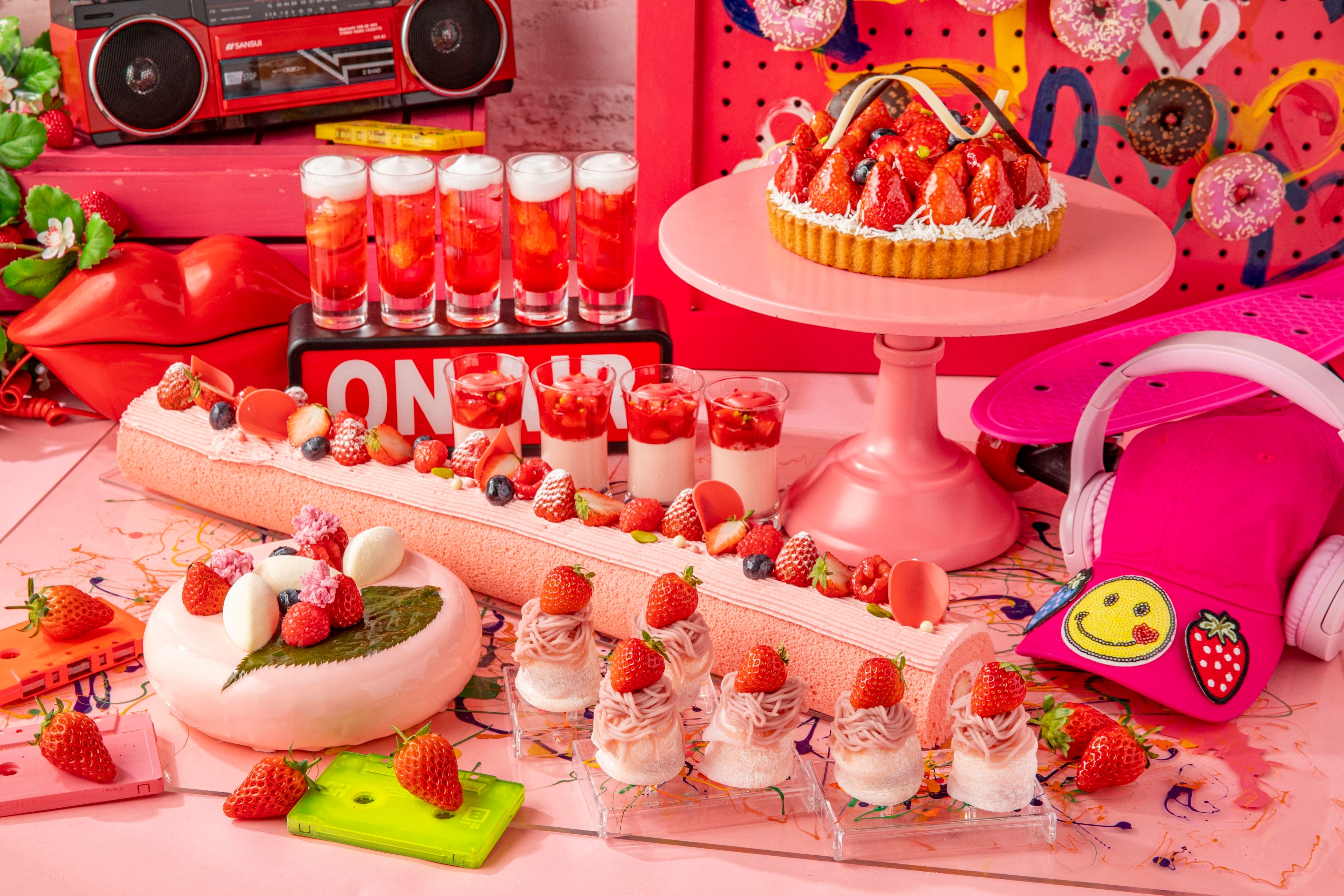 【スイーツコーナー】ポップで遊び心溢れるストロベリーと桜のスイーツをお楽しみください。
