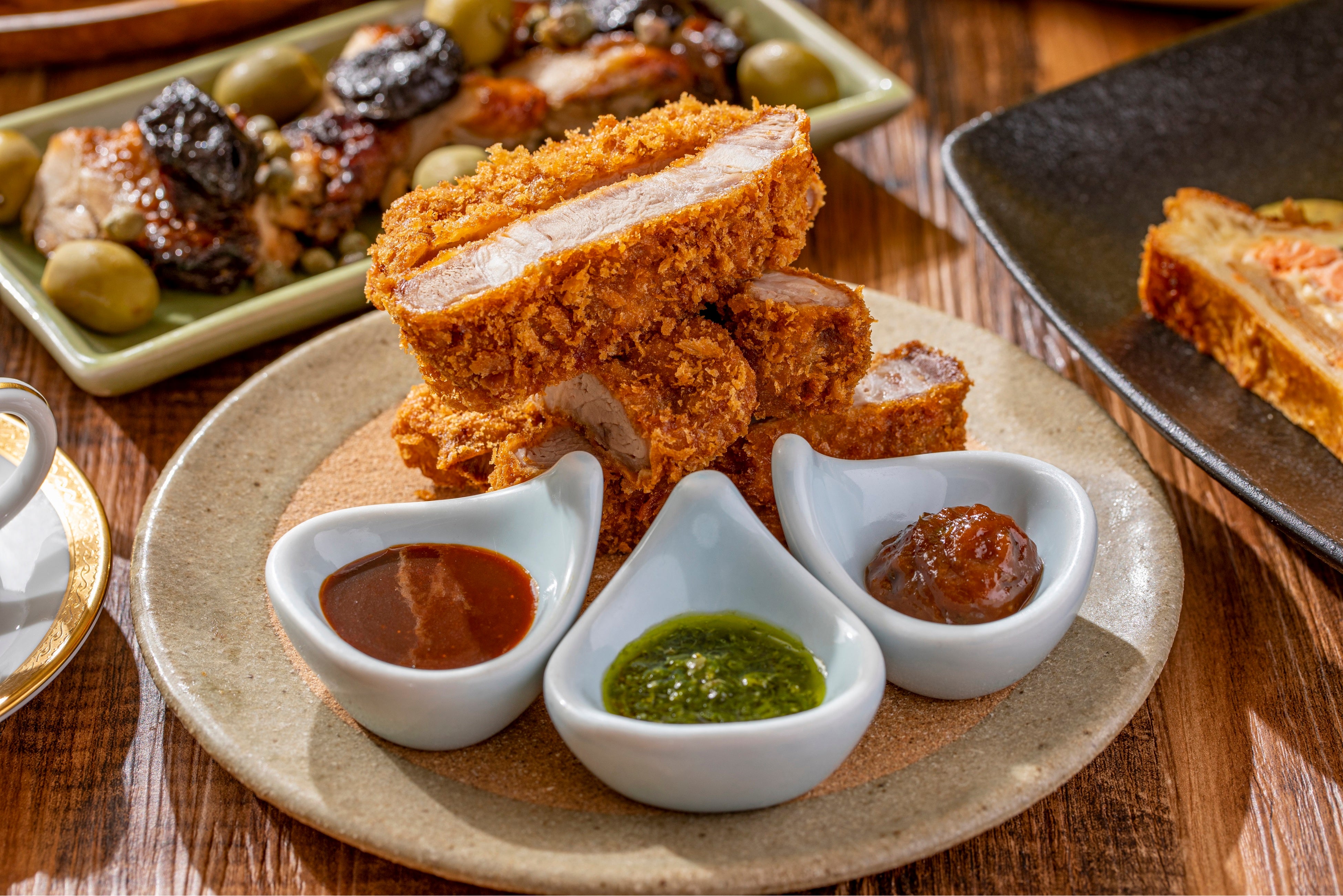 名古屋名物味噌カツの赤みそだれに、新しい味噌だれ2種(マンゴー味噌だれと蓬生味噌だれ)を加えました。