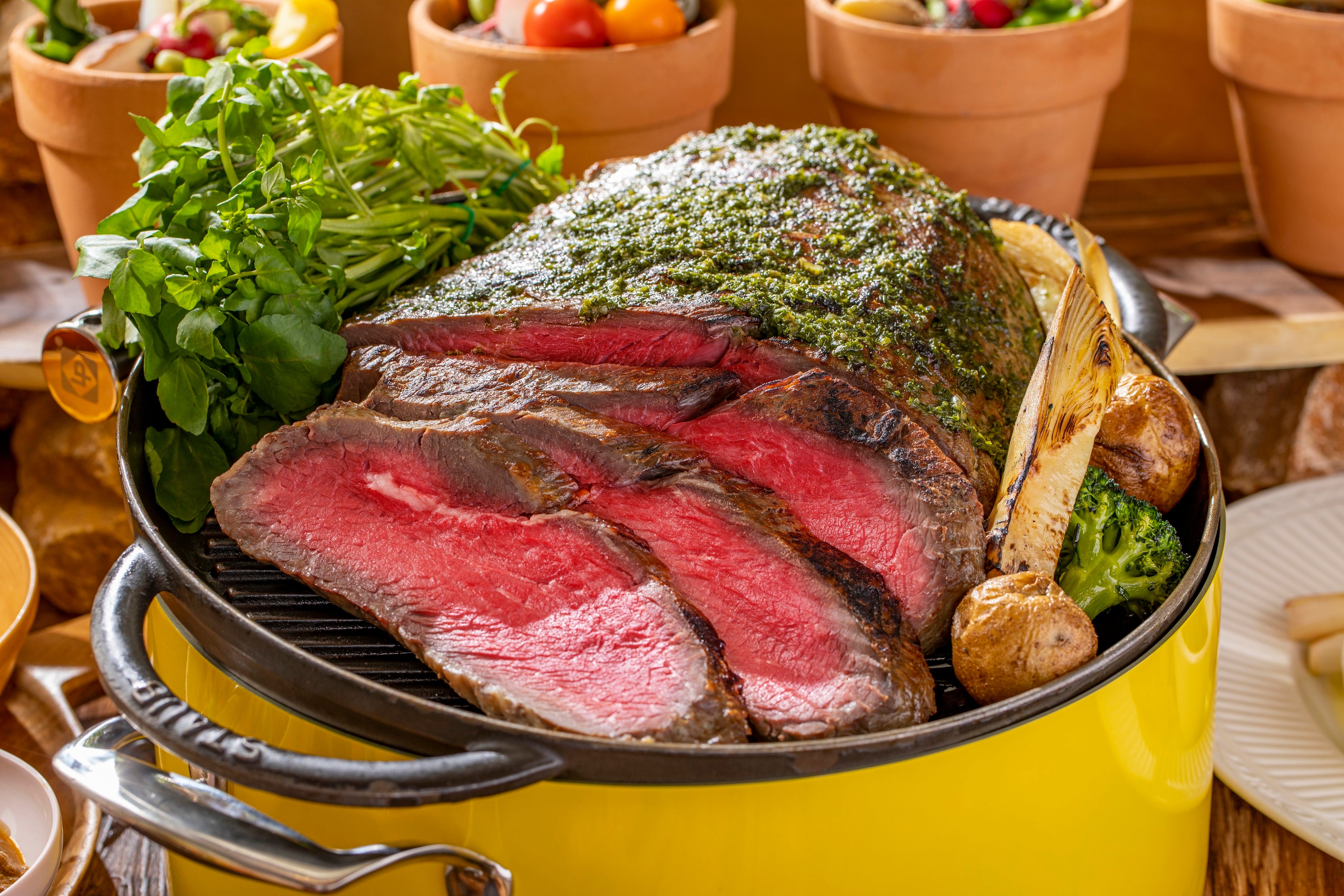 ほんのりとスモークをかけ、じっくりとローストしたのち、仕上げにグリルして香ばしく仕上げています。ルッコラと純粕酢のさわやかな風味のオリジナルピストゥを添えて。