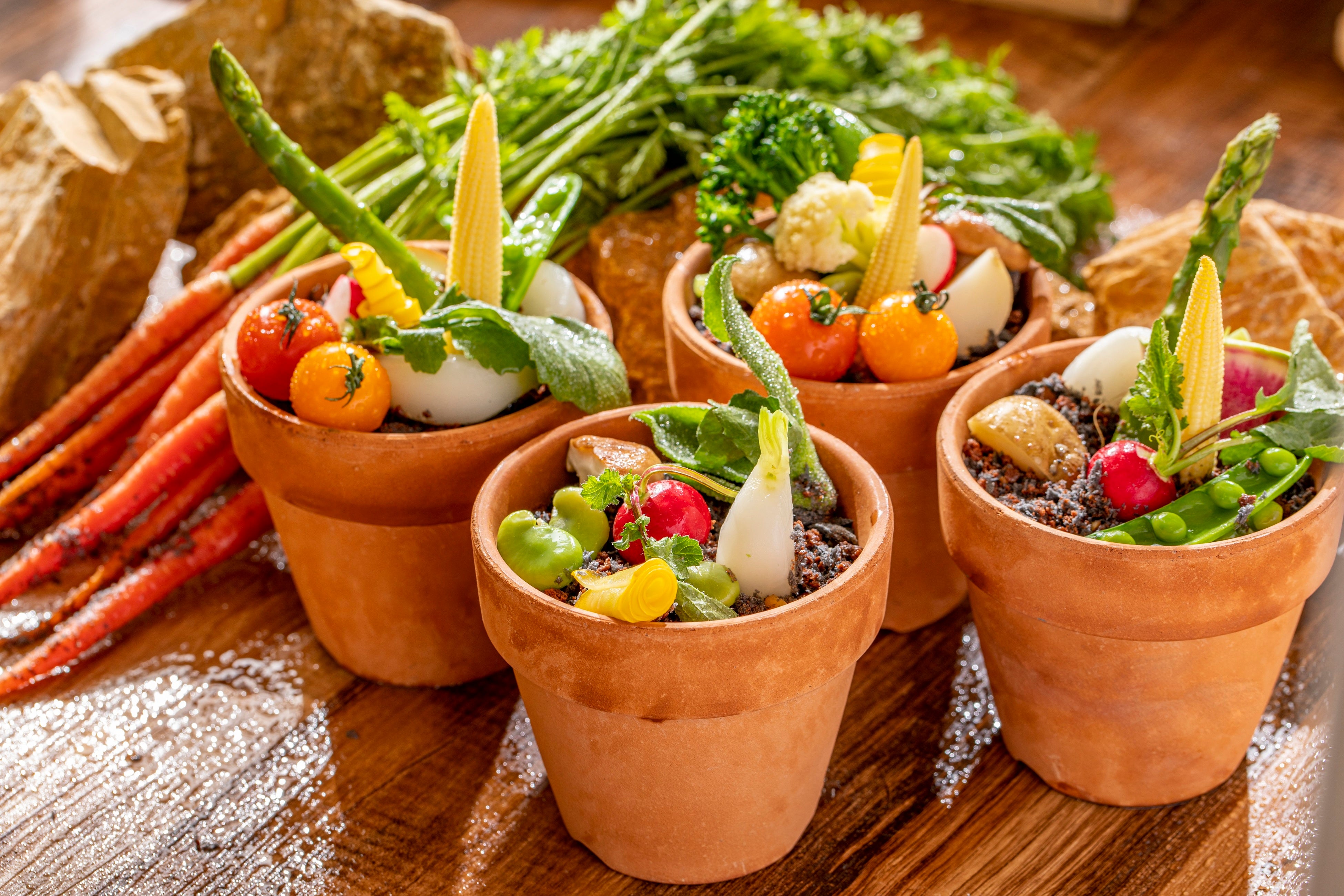 畑で収穫してそのまま食べるイメージの、食べられる土に植えられたミニチュア野菜。
