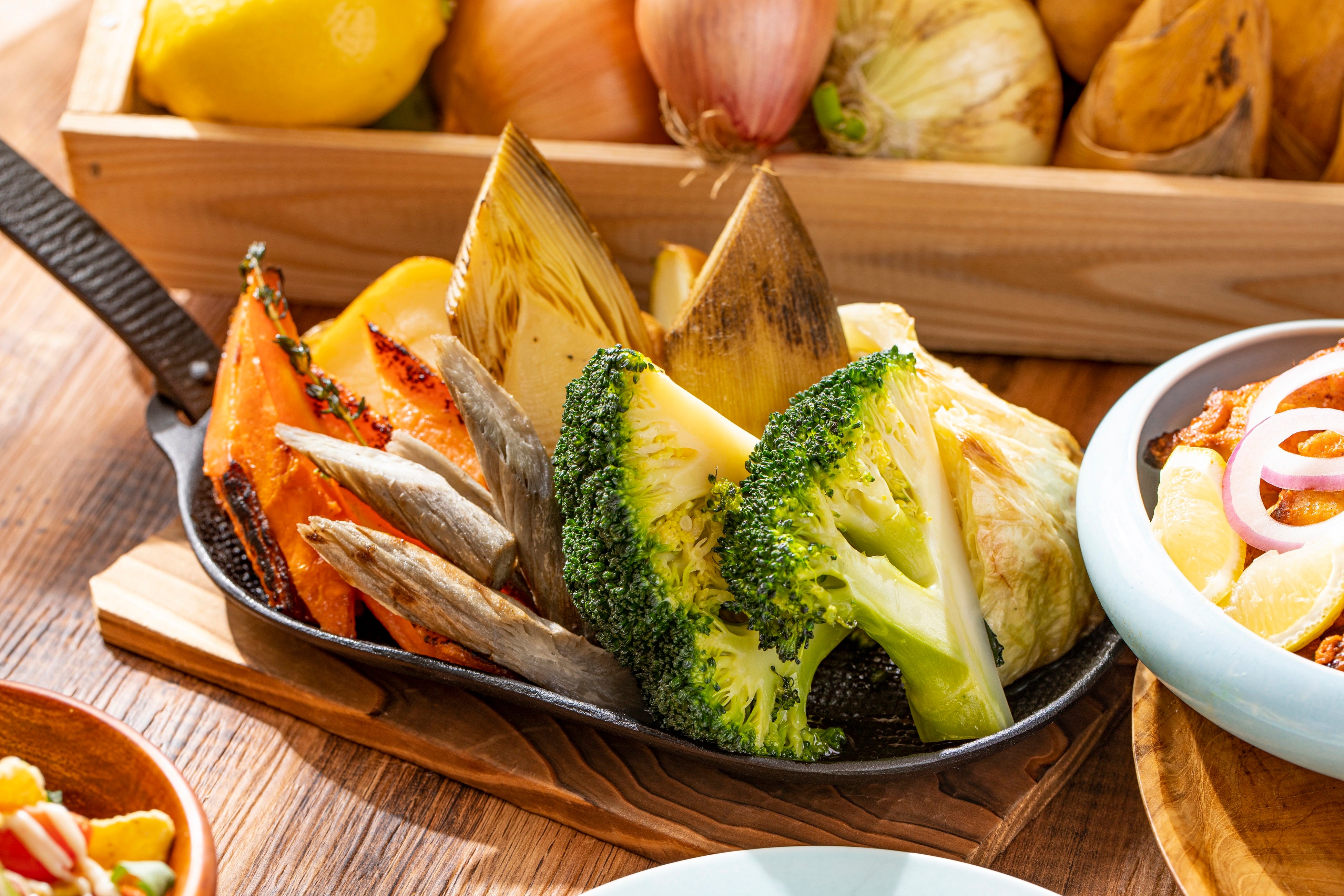 愛知県の農家を中心に仕入れた新鮮な野菜を丸ごとローストし、その場で切り分けて提供。