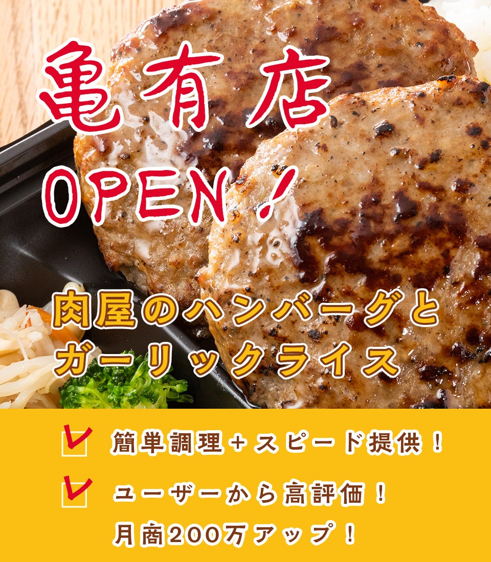 株式会社エフ・エフ・アルファ(本社:東京都新宿区、代表取締役:渡辺 真人)は、デリバリー専門店として、簡単調理・リーズナブル。月商200万円UPの実績を出した「肉屋のハンバーグとガーリックライス」を全国に積極展開しております!この度出店エリアを拡大!この度、亀有店が2月22日オープン致します!