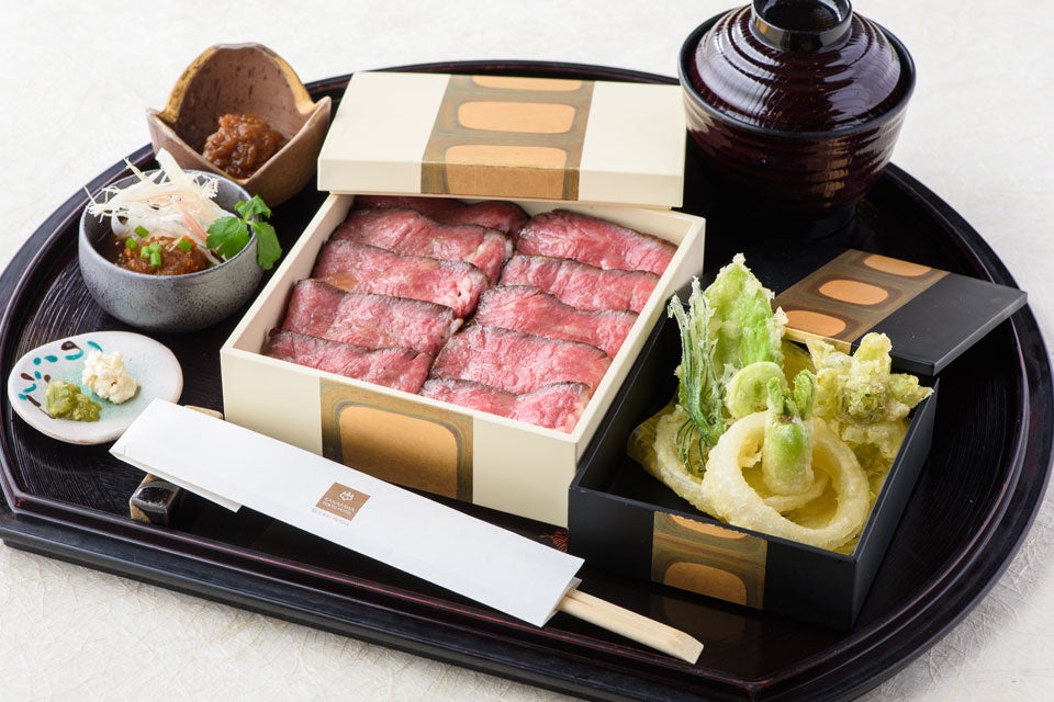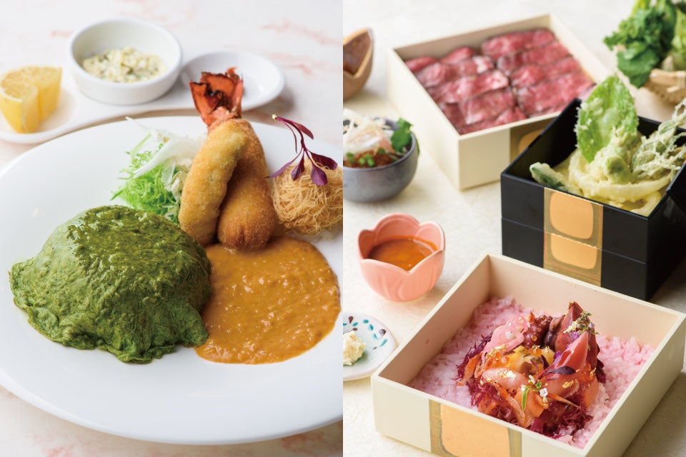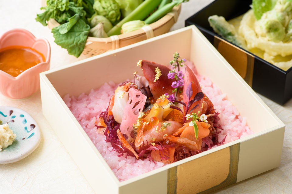 この春は「古代箔」と呼ばれる金箔をあしらったお重に入れた2種類のメニューもご用意いたします。「能登牛のローストビーフ ~極み重~」は、新玉葱をすりおろしたさっぱりとしたおろしポン酢ソースと新玉葱を甘みが出るまでじっくりと炒めたオニオンチャツネの2種のソースで味の変化をお楽しみください。魚介のマリネと野菜を、洋風の寿司酢で作った酢飯にのせた色鮮やかで豪華な「洋風シーフードちらし ~桃色ファンタジー~」は、多彩な食感と風味を味わえます。どちらのメニューも季節の春野菜の天ぷら、加賀味噌の味噌汁がついており、お得な内容です。