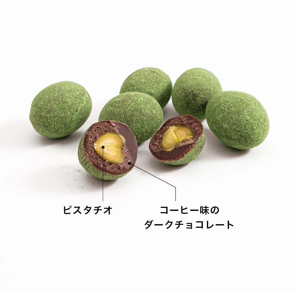 キャラメリゼしたピスタチオを、アラビカ豆100%のコーヒーを混ぜ込んだダークチョコレートでコーティングしました。まろやかなピスタチオのコクと、コーヒーの濃厚な風味、心地良い塩味をお楽しみいただけます。甘さ控えめで、お酒のお供にもおすすめです。