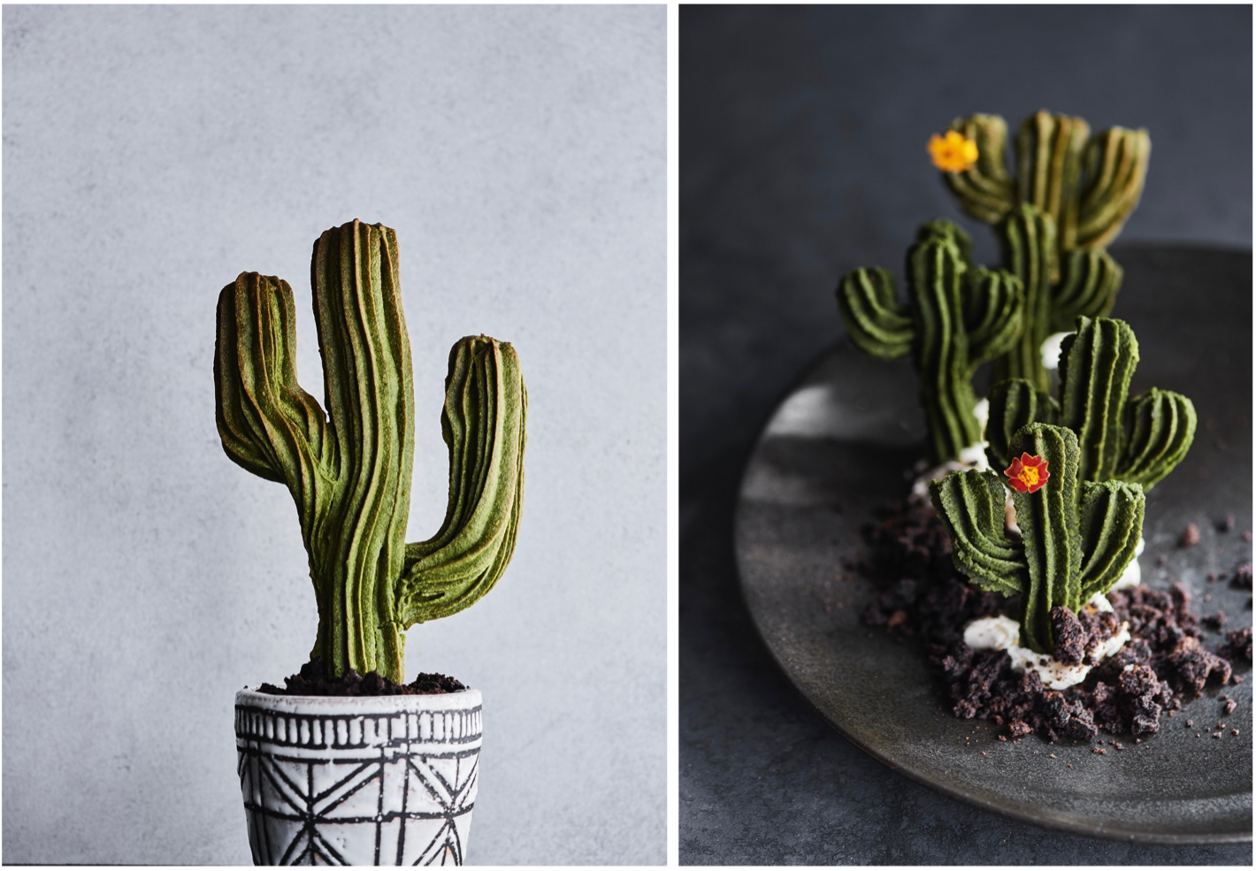 スペイン発祥の揚げ菓子・チュロスの生地に抹茶を練り込んで、サボテンに見立てました。土の部分にはクッキークランブルとクリームを使用し、余すところなくお召し上がりいただけます。見た目にも楽しい遊び心あふれるメニューです。
