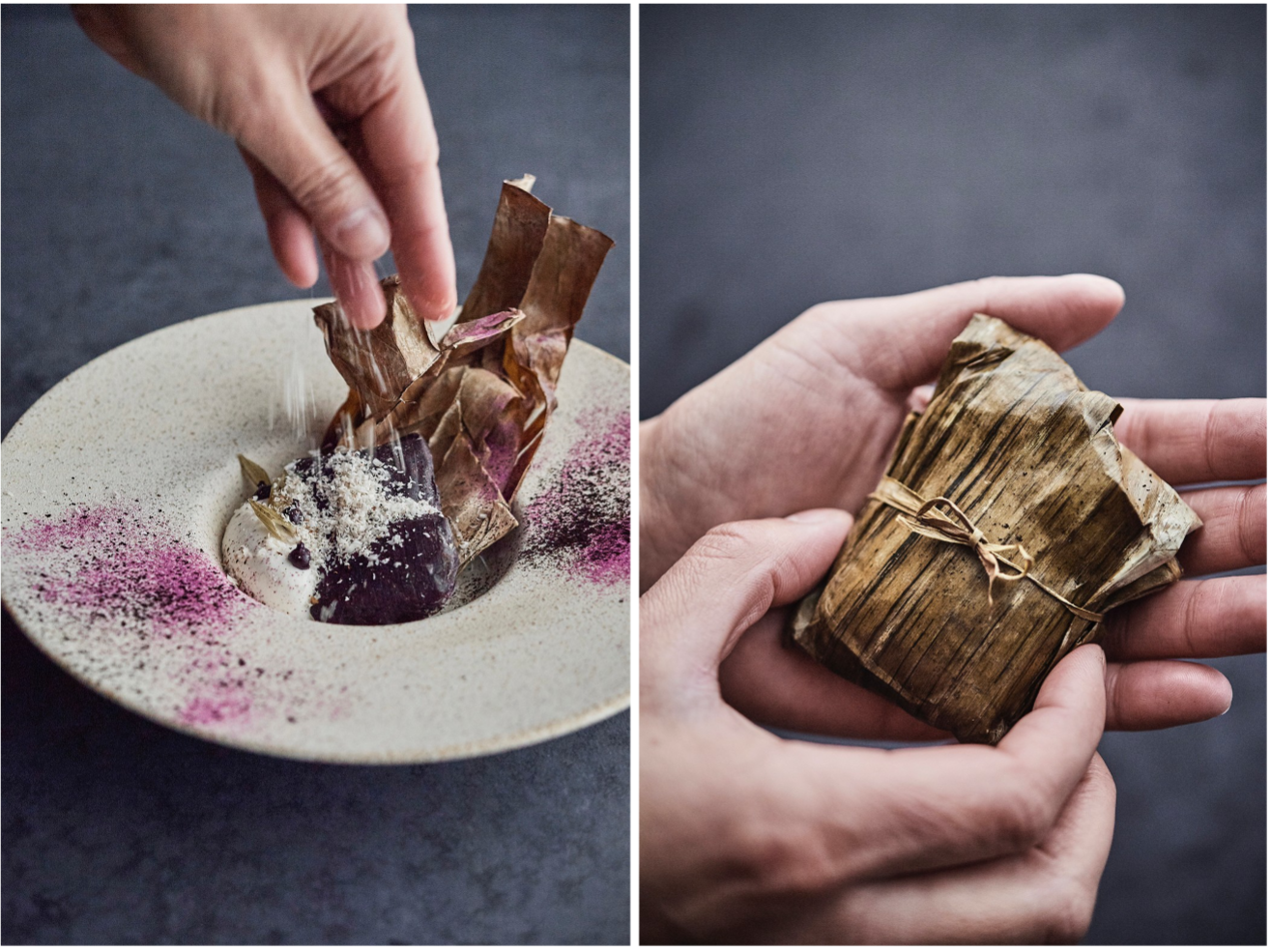 バナナの葉で食材を包んで蒸すメキシコの定番料理タマルを、ガトーショコラ仕立てにローストしました。完熟した青唐辛子を乾燥させた”チレアンチョ”の香りを移したクリームと、ふわふわに削ったアーモンドをかけた贅沢なデザートです。