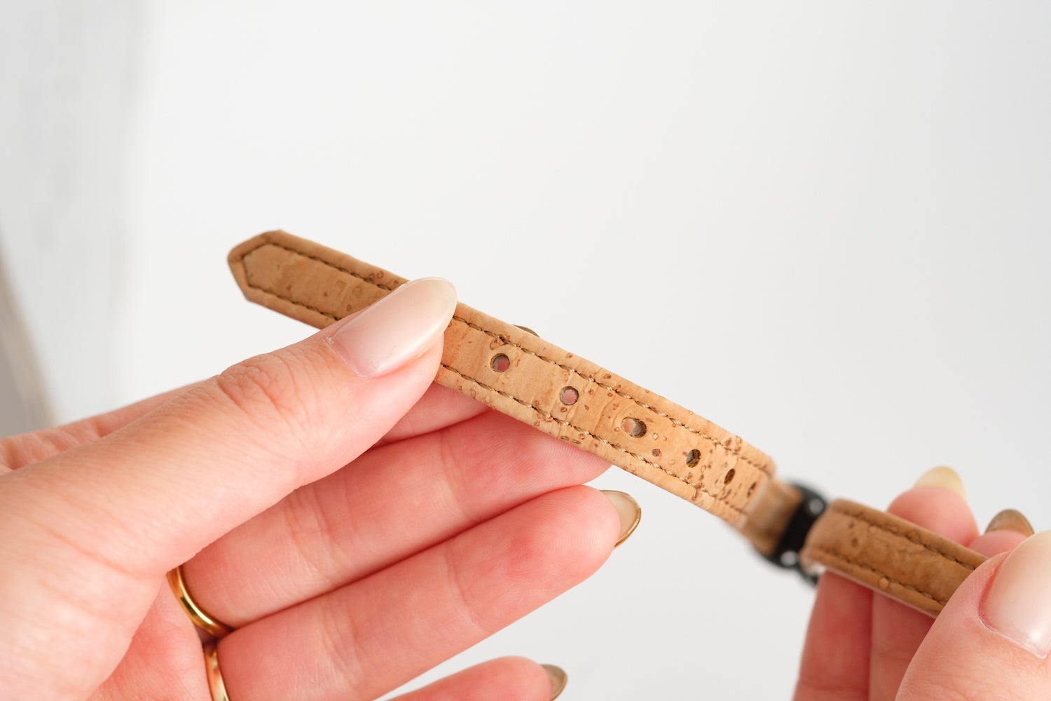 首輪の外側は、超軽量で水に強い特徴を持つ「アップルレザー」を使用。万が一水をこぼしてしまっても、サッと拭くだけでお手入れが完了します。また、内側には肌当たりが優しい「コルクレザー」を採用。初めて首輪をつける猫ちゃんも、違和感なく着用いただけます。