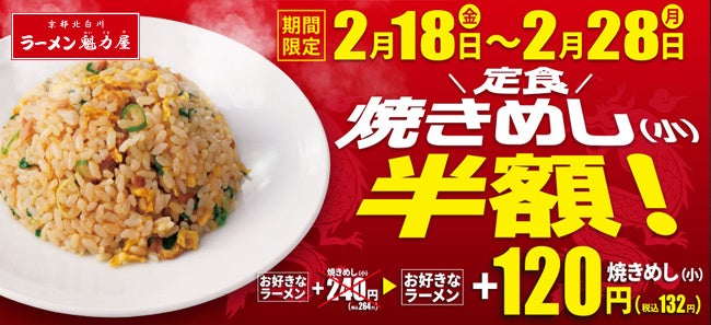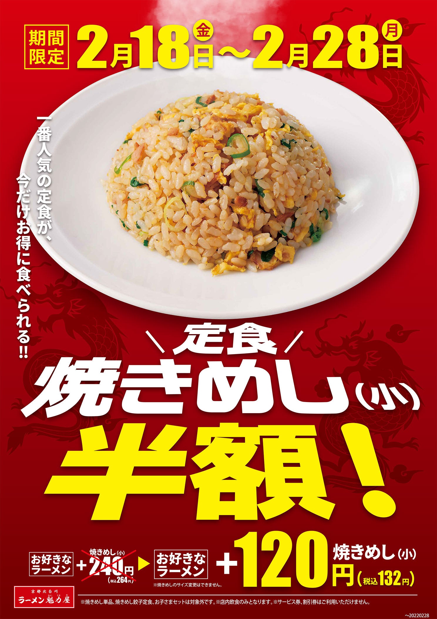 京都北白川ラーメン魁力屋をチェーン展開する株式会社魁力屋、(http://www.kairikiya.co.jp本社:京都市中京区、代表取締役社長:藤田 宗、以下魁力屋)は、2022年2月18日(金)より、期間限定「定食焼きめし半額フェア」を実施いたします。