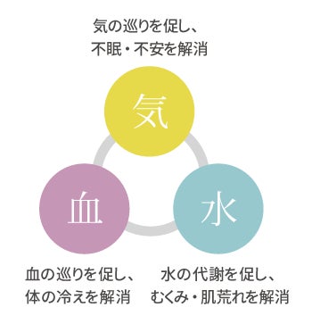 東洋医学で人間の体は、気の巡りを促し不眠・不安を解消する「気」、血の巡りを促し体の冷えを解消する「血」、水の代謝を促しむくみ・肌荒れを解消する「水」によって成り立っており、このバランスが崩れると体に不調をきたすと考えられている。Minotteスイーツブレッドはこの考えに基づき、漢方素材を配合している。