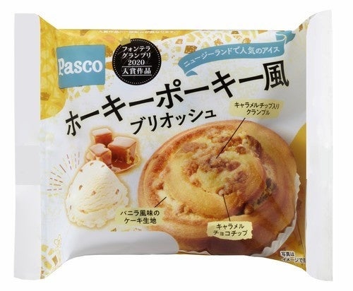 商品特長:ニュージーランドで人気のアイス「ホーキーポーキー」をイメージした商品です。グラスフェッドバターを一部使用したブリオッシュ生地にキャラメルチョコチップとバニラ風味のケーキ生地を巻き込み、キャラメルチップ入りクランブルをトッピングして焼き上げました。(写真は敷島製パンより店頭で販売される商品です。)