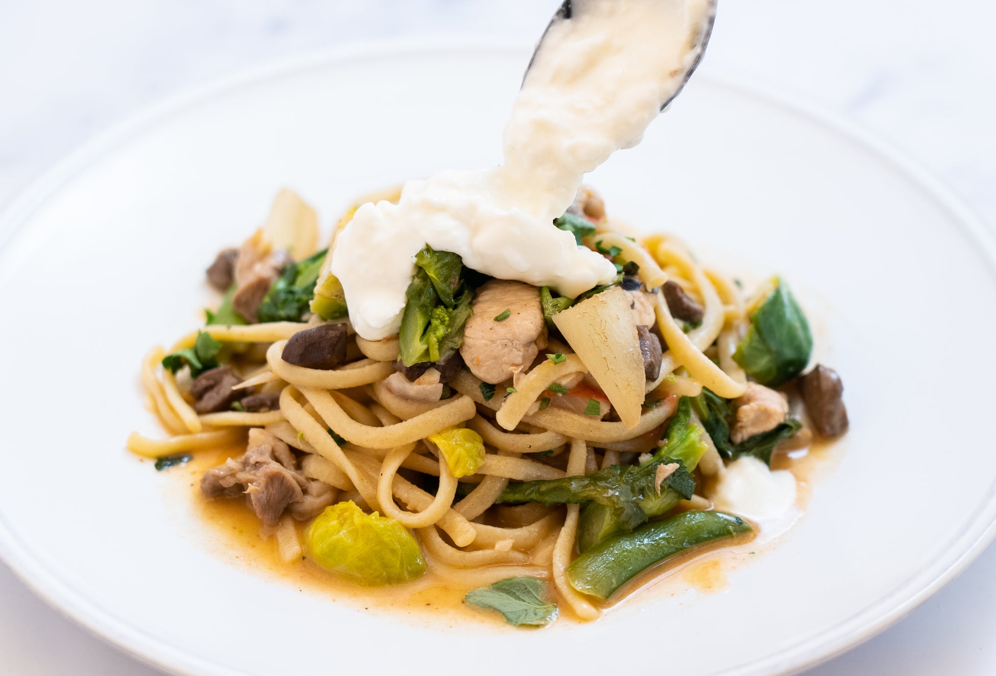 ホロホロ鶏と春野菜のラグー&自家製ストラッチャテッラと石臼挽き小麦のリングイネ