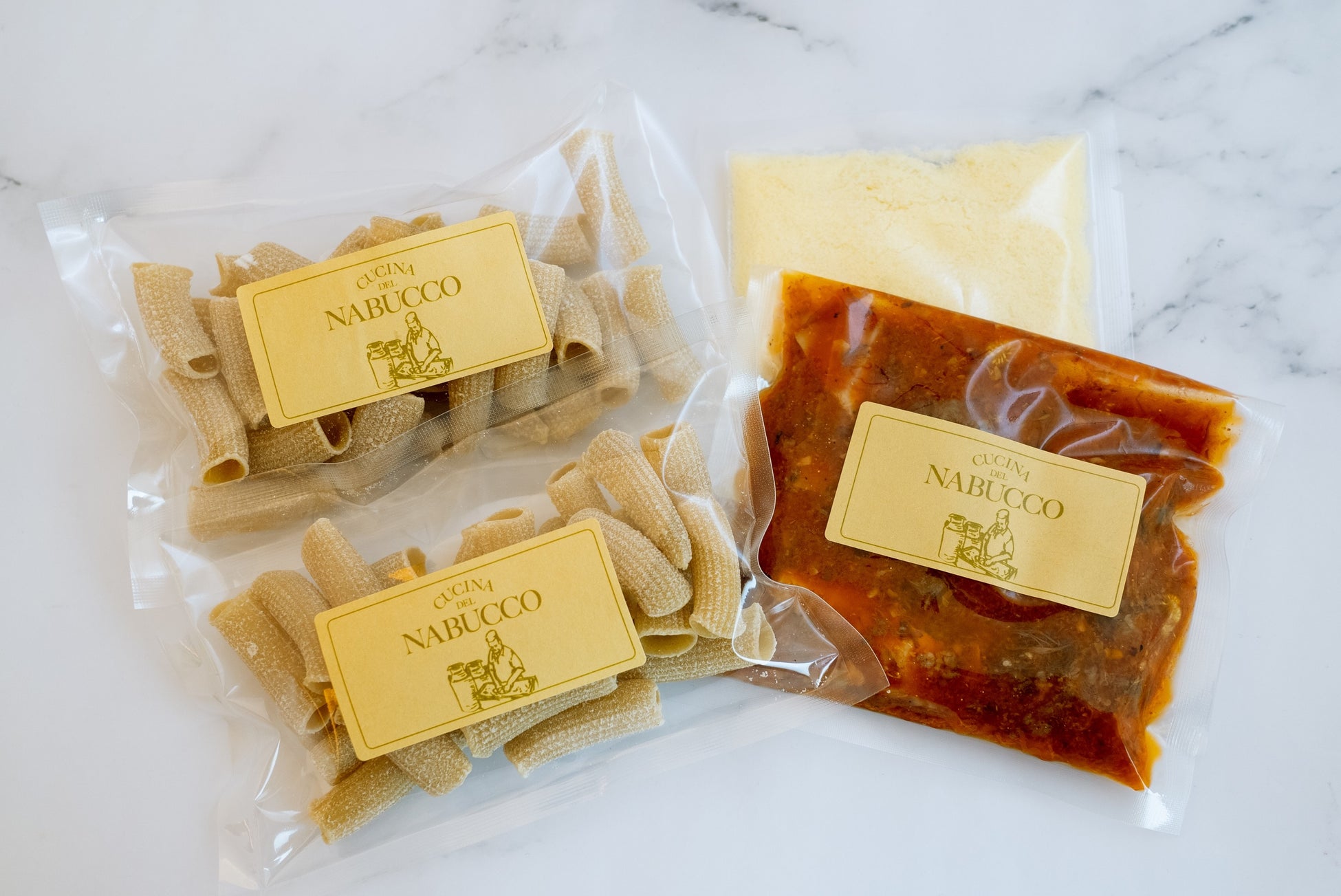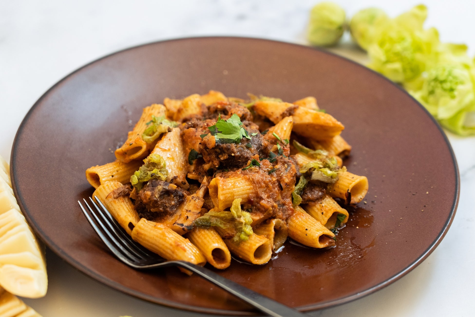 太いマカロニのようなショートパスタ「リガトーニ」は、表面に線が入っており、濃厚な煮込みのソースとよく合います。是非、赤ワインとご一緒にお召し上がりください。