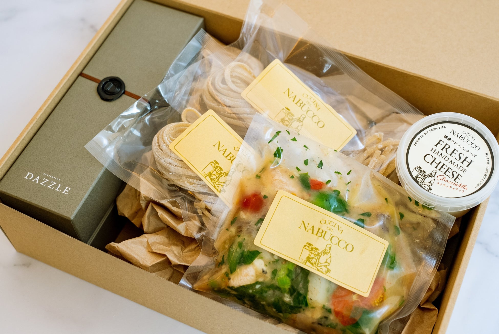 HUGEオンラインショップ「HUGEst.」(ヒュージスト)では、パスタセット単体の他、NABUCCOのフレッシュブッラータや、銀座DAZZLEのショコラテリーヌとのセット販売もしております。
