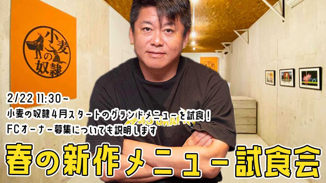 この度、2月22日(火)にYouTube【ホリエモンチャンネル】にて「小麦の奴隷FCオンライン説明会」と4月スタートのグランドメニューに加える商品の試食会を「小麦の奴隷LABO×MITSUME」より配信します。