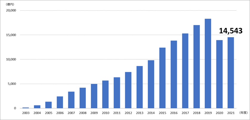 当社の国内最大級のフード業界向け受発注プラットフォーム「BtoBプラットフォーム 受発注」を利用した、飲食店とその取引先である食品卸企業との受発注の流通金額を見てみると、2003年から堅調に拡大してきましたが、パンデミックの渦中にあった2020年は減少したものの、2021年は1兆4,543億円と増加傾向にあります。