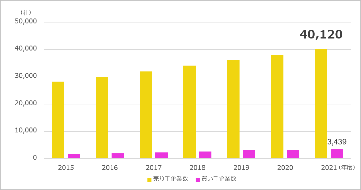 また、「BtoBプラットフォーム 受発注」の利用企業数を見てみると、売り手(食品卸・メーカー企業)、買い手(飲食店)共に増加しており、2021年は、売り手企業数が40,120社、買い手利用企業数が3,439社(66,010店舗)となり、2020年以降のコロナ禍においても堅調に増加しています。
