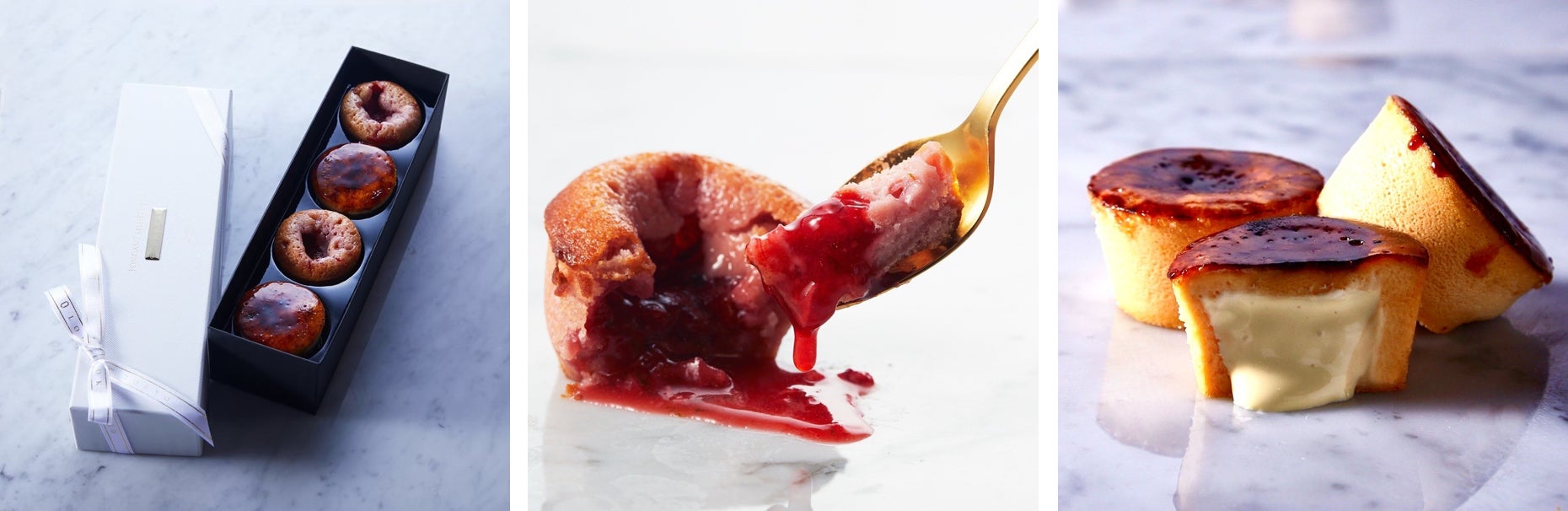 フォンダンルビーは、希少なルビーチョコレートを使用した生地に、シャンパンあまおうソースが中から流れ出る爽やかで濃厚な新感覚フォンダンショコラです。また、パリトロは、表面は「パリッ」と、中は「とろーり」の二つ食感が人気のチーズケーキ。フランス産のクリームチーズとデンマーク産のクリームチーズを独自に黄金比で配合し、チーズの口溶けと食感にこだわっています。