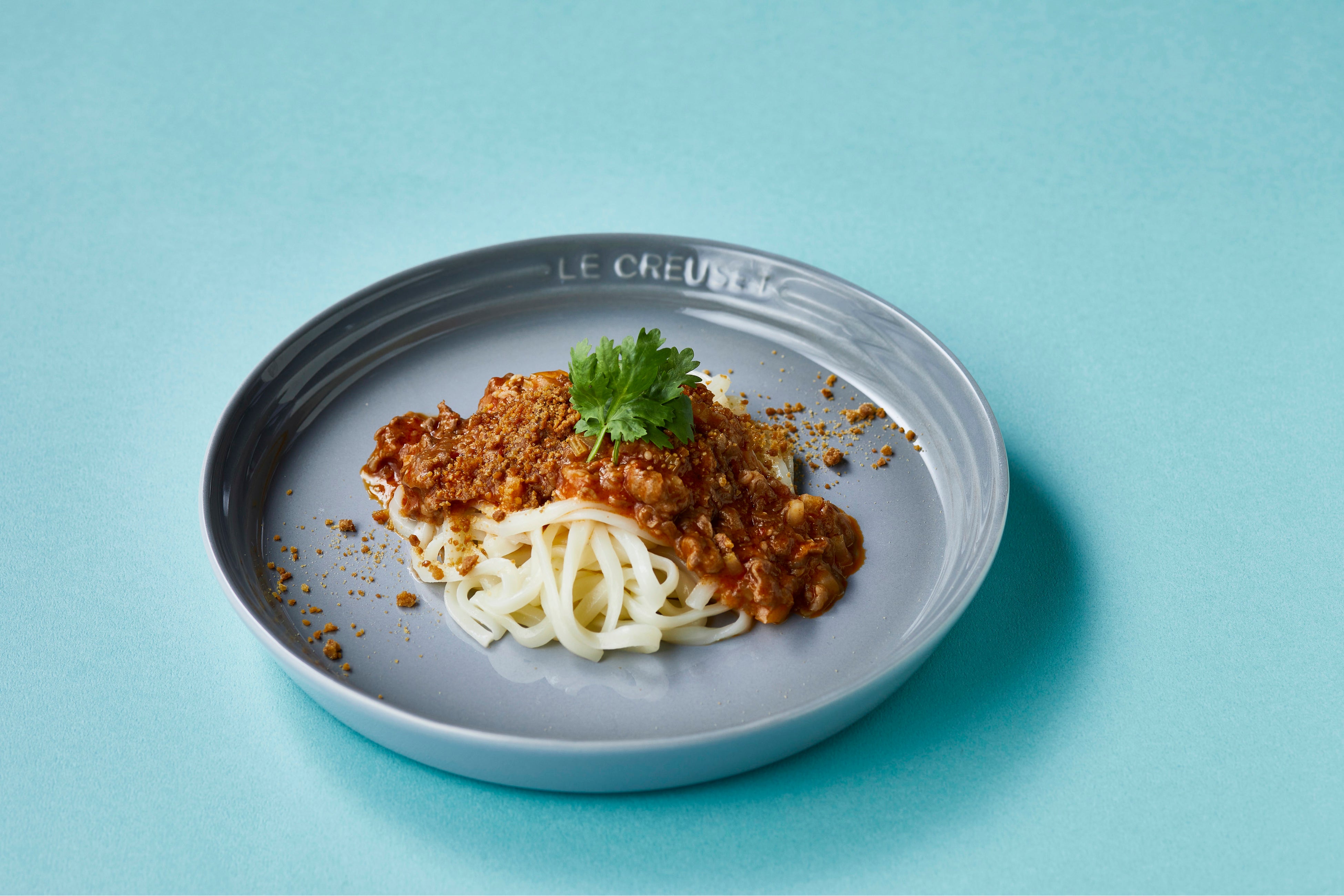 鬼崎シェフに考案いただいたヌードルは、トマトを強火で炒め旨味をグッと引き出し、そこに牛肉を煮込んだ時に出る独自の甘みと豆板醤の辛味を合わせたトマトソースヌードルです。豆腐を発酵させた調味料(腐乳)とカカオバターとのマリアージュがお楽しみいただけます。