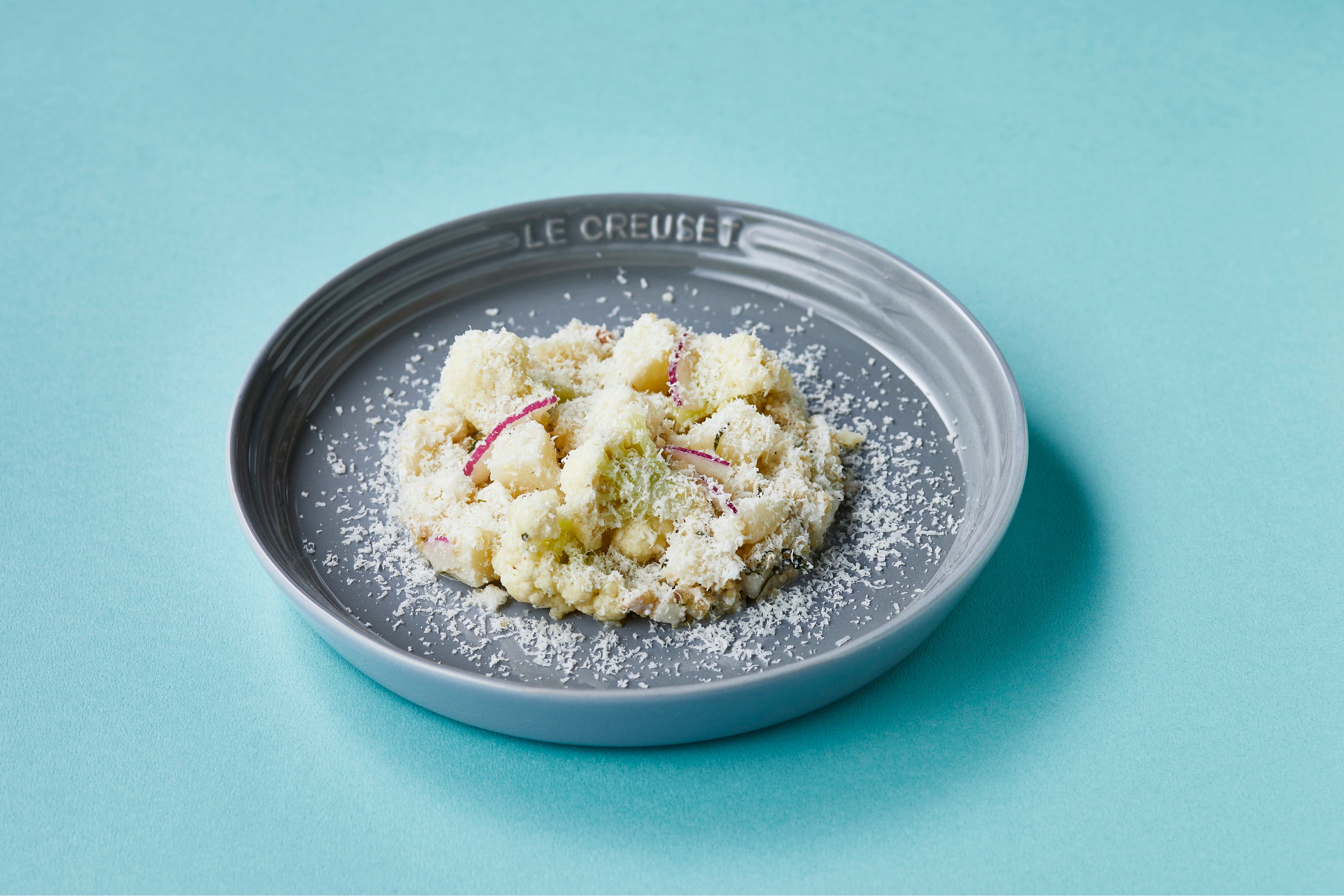 「unis」の薬師神シェフに考案いただいたポテトサラダは、ポテトの他にもカリフラワー・大根・長芋・キヌアを合わせ、カカオパルプの甘酸っぱいドレッシングで和えました。たっぷりのチーズを仕上げにかけた、ヘルシーでちょっと贅沢なポテトサラダです。