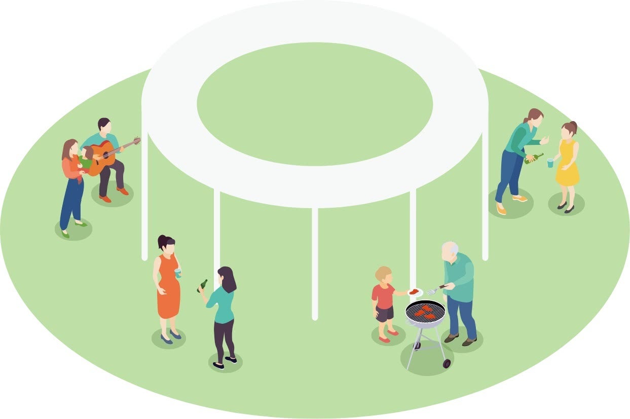 店名の由来となった「円居る(まといる)」どおり、円を描く形にデザインされていて、木々を多くあしらい、 広いお庭で団らんするようにBBQを楽しむことができます。同じ公園内には体育館や野球場、スケートボードパーク、 健康施設、遊具広場などがあり、家族連れやカップルのお出けに最適な環境です。