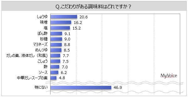 ■こだわりがある調味料は「しょうゆ」「味噌」「塩」が上位3位。2種類以上常備している調味料は「しょうゆ」「塩」が家に調味料がある人の各2割強、「こしょう」「味噌」「ソース」「砂糖」「酢」「だしの素、液体だし」が各10%台