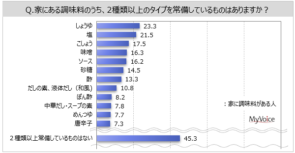 ■こだわりがある調味料は「しょうゆ」「味噌」「塩」が上位3位。2種類以上常備している調味料は「しょうゆ」「塩」が家に調味料がある人の各2割強、「こしょう」「味噌」「ソース」「砂糖」「酢」「だしの素、液体だし」が各10%台
