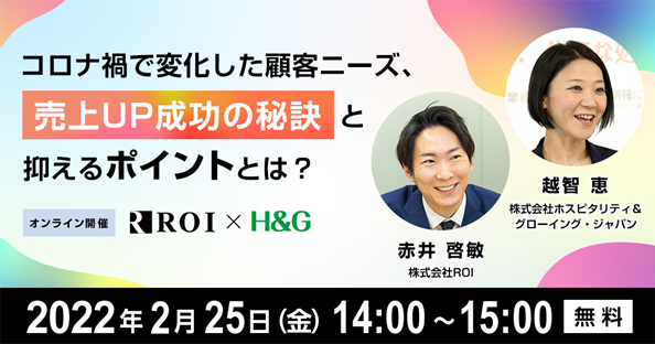国内最大級の顧客満足度向上プラットフォーム「ファンくる」を運営する株式会ROI(本社:東京都千代田区、代表取締役社長:山口敬人)は、株式会社ホスピタリティ&グローイング・ジャパン(本社:東京都新宿区、代表取締役社長:野中知明)と飲食店応援セミナー「コロナ禍で変化した顧客ニーズ、売上UP成功の秘訣と抑えるポイントとは?」(定員:8 0名/無料)を2月25日(金)に共催いたします。(申し込み先:https://biz.fancrew.jp/seminar_contact?=pr1)