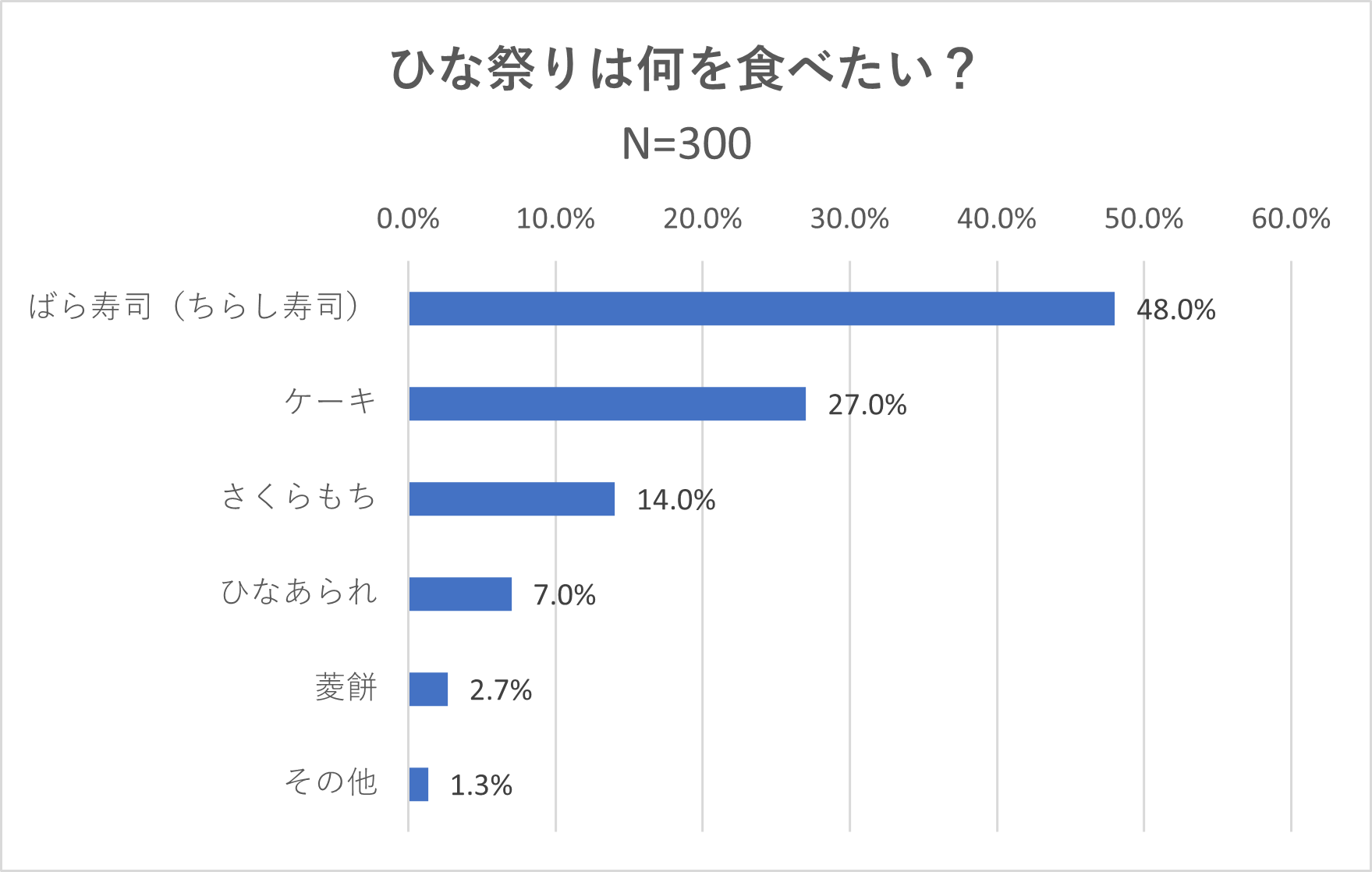 また、「ひな祭りは何を食べたいか」を聞いたところ、ばら寿司(ちらし寿司)が断トツ1位の48%となりました。以下、「ケーキ」(27%)、「さくらもち」(14%)、「ひなあられ」(7%)、菱餅(2.7%)でした。