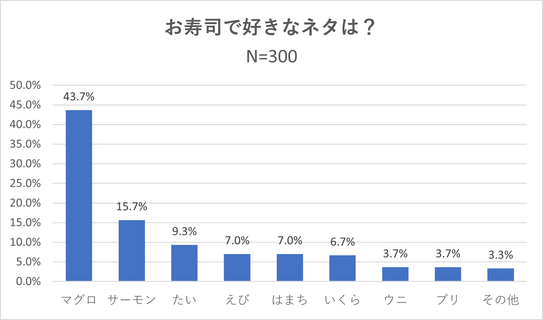 「お寿司で好きなネタ」を聞いたところ、断トツの1位は「マグロ」(43.7%)でした。以下、「サーモン」(35.7%)、「たい」(9.3%)、「えび・はまち」(7%)、「いくら」(6.7%)、「ウニ・ブリ」(3.7%)という結果になりました。
