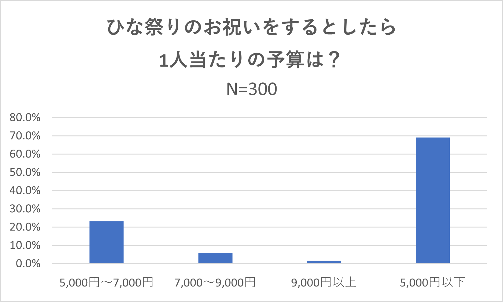 「ひな祭りのお祝いをするとしたら1人当たりの予算は」という質問には、69%が5,000円以下と答えました。次に多いのが23.3%の「5,000円~7,000円」で、「7,000~9,000円」は6%、「9,000円以上」は1.7%という結果になりました。