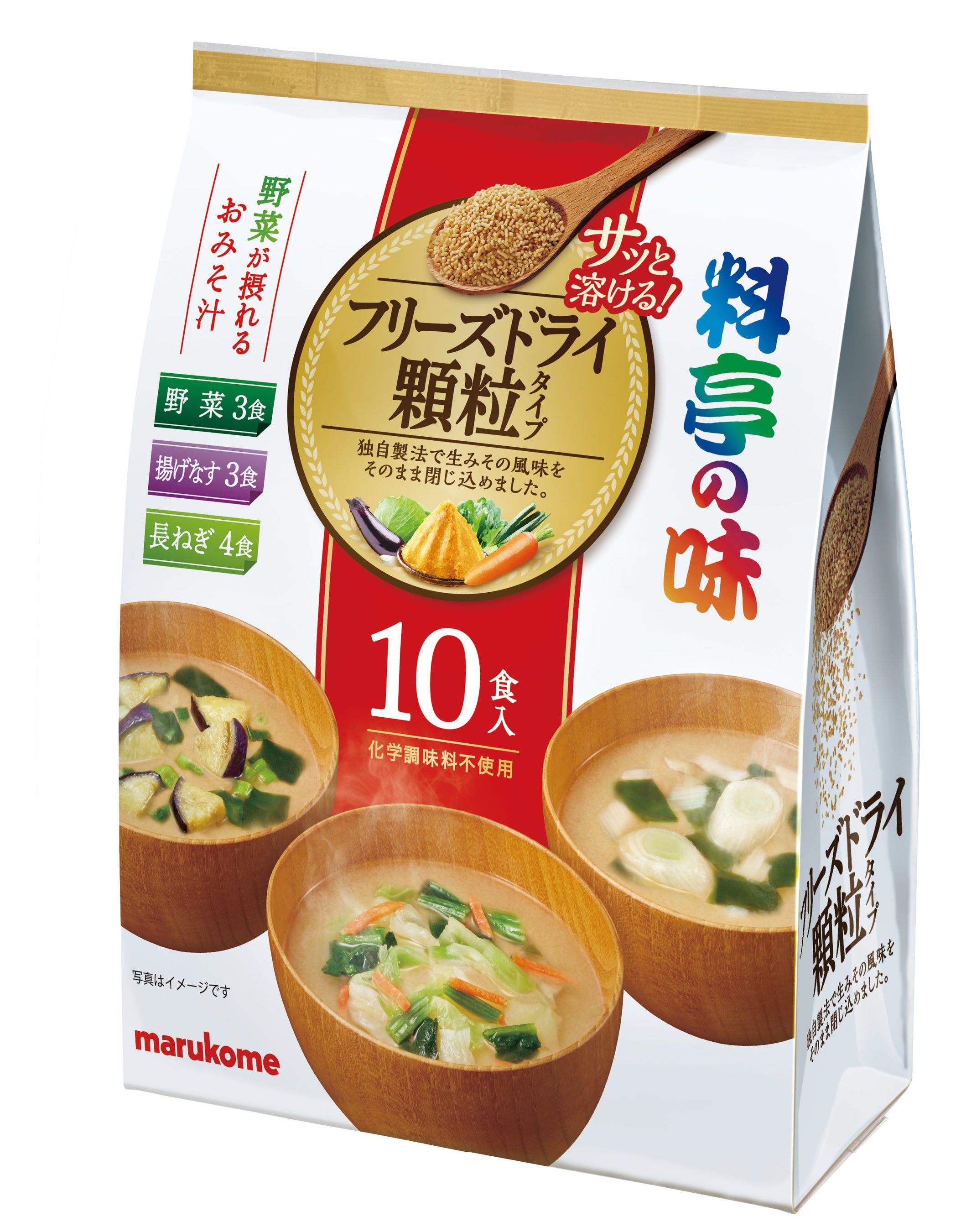 野菜・なす・長ねぎのアソートタイプの即席みそ汁。特許製法で生みその風味をそのまま閉じ込めた顆粒みそを使用。1パックに、みそと具材が充填されているため、ゴミが少なく、容器にあけてお湯を注ぐだけで簡単に本格的なみそ汁を楽しめます。顆粒だから手が汚れず、お湯が冷めにくいのも特徴。賦形剤(ふけいざい)不使用で、アルコール分0.1%未満です。