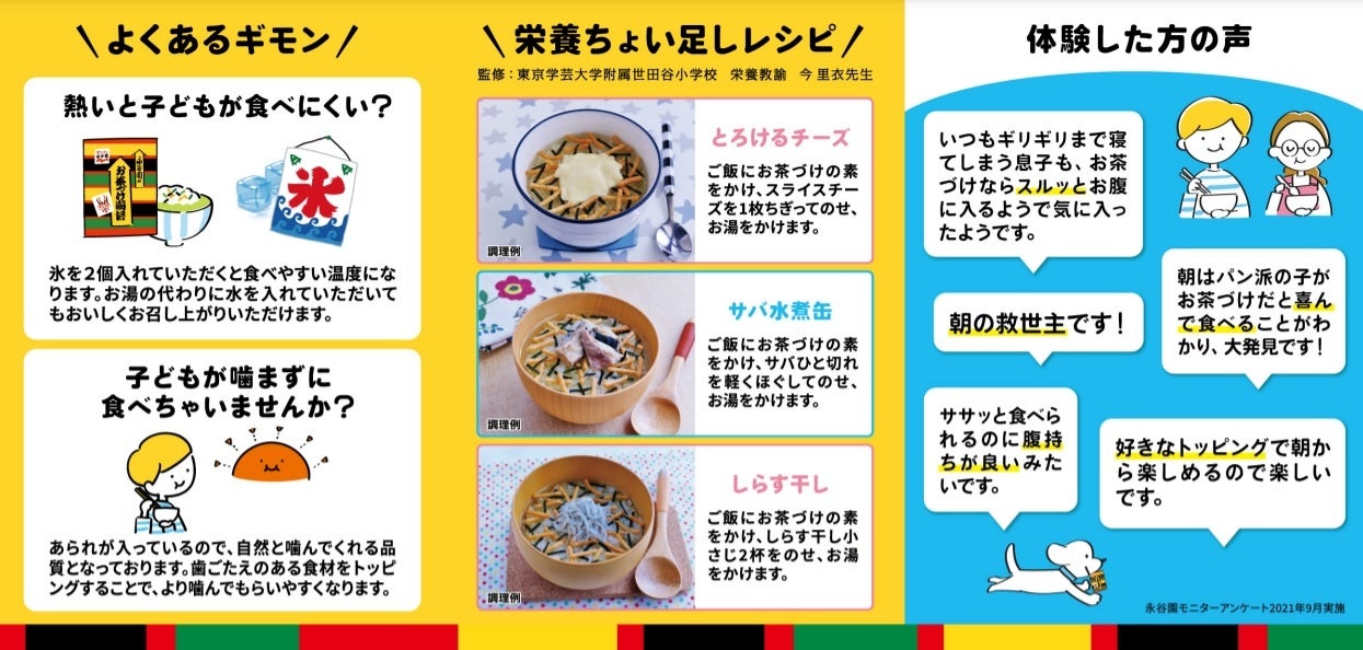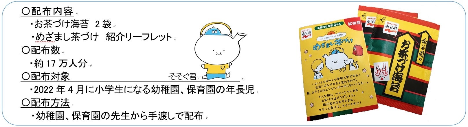 株式会社 永谷園(社長:五十嵐 仁、東京都港区)は、2022年4月に小学生になる幼稚園・保育園の年長児を対象に、2022年3月上旬より、「お茶づけ海苔」のサンプリングを実施いたします。