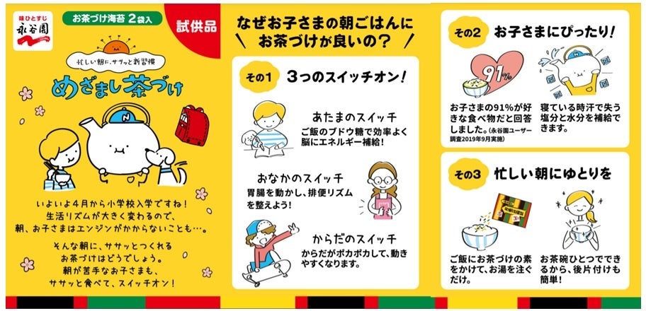 そんな新しい生活を迎える親子の不安を解消するツールとして、子どもが自ら朝食を食べてくれる「めざまし茶づけ」を多くの方に体験していただきたい。そんな思いから、今回サンプリングを実施することになりました。
