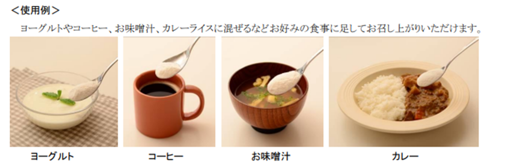 ① 溶かしやすく、ほとんど無味無臭のプロテイン粉末のため、お好みの飲み物や料理に使用いただけます。通常の 日常生活の中で無理なく手軽にたんぱく質を摂取いただけます。