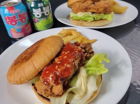 アメリカで大流行しているチキンバーガー。まにぽぽの大人気、韓国フライドチキンを、普段のチキンの約3倍の大判チキンをバーガー用に作成。ボリューム満点の大判のチキンは、フライドチキンでもおなじみの7種類のソース(黄金・ヤンニョム・ハニーマスタード・ハニーコンボ・カンジャン・スノーチーズ・激辛ヤンニョム)から味付けをお選びください。バンズは直径10㎝越えのビッグサイズ。そのバンズをバターと一緒に火を通すことで、食欲そそる香りが漂ってきます。レタスのシャキシャキ、チキンのザクザクの食感も楽しんでいただけます。